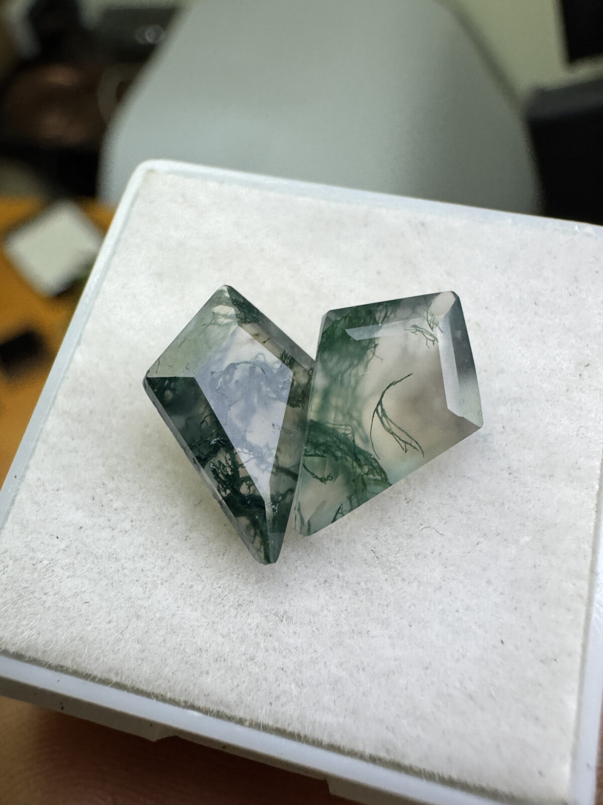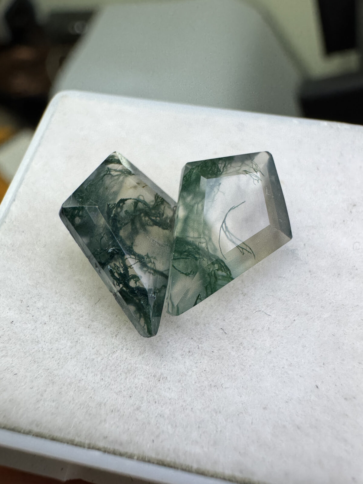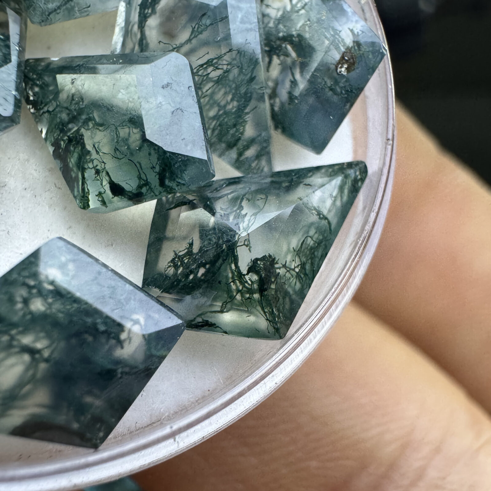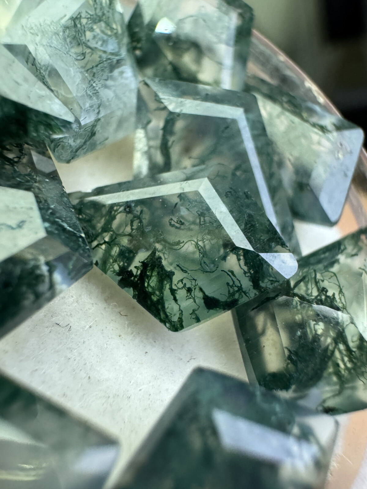 Ágata Musgo natural com lapidação facetada e transparência suave. Apresenta inclusões verdes orgânicas características, que lembram ramos e musgos naturais. Cada pedra é única em padrão e tonalidade, ideal para joias artesanais e peças exclusivas. Polimento fino e boa calibração.
