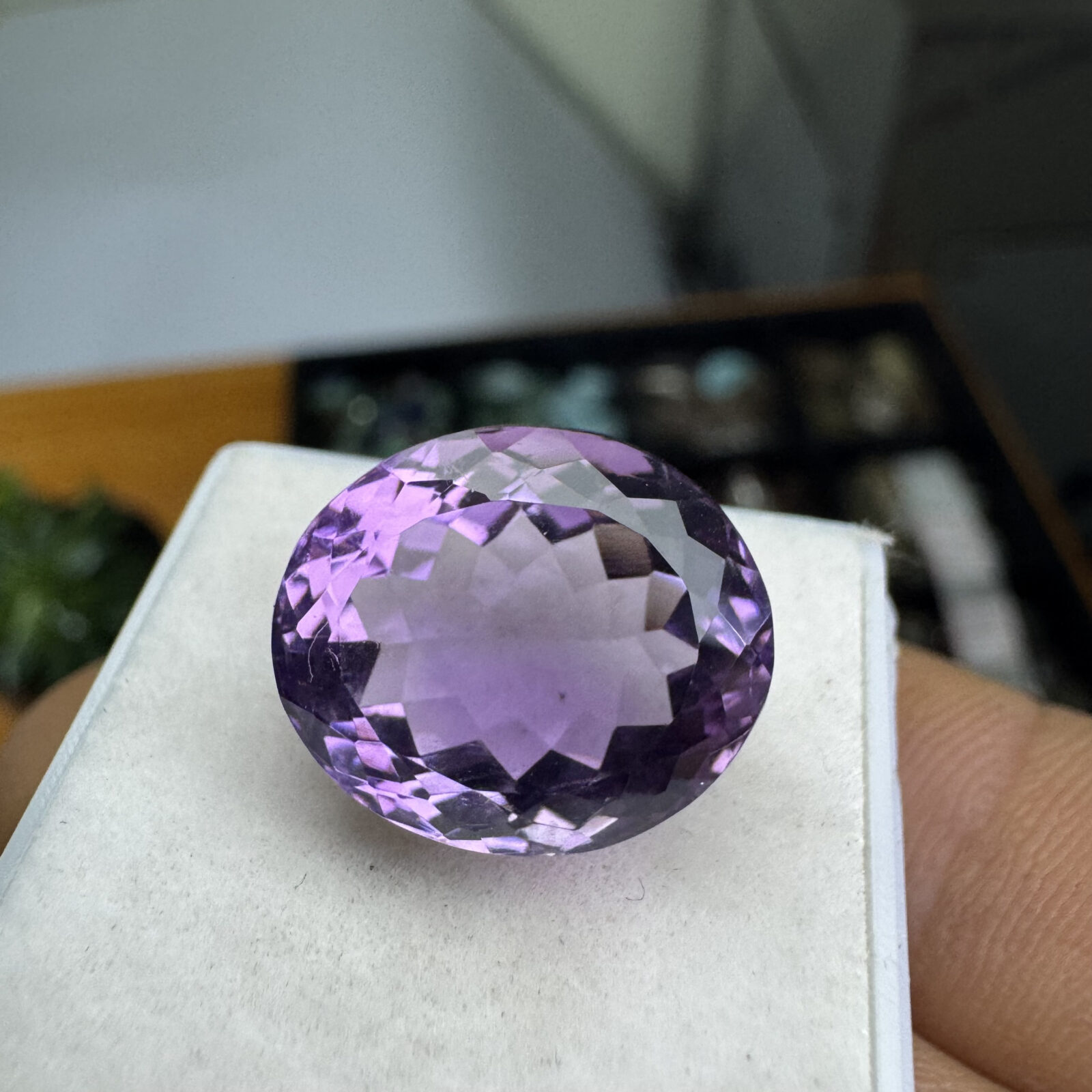 Ametista natural com cor violeta intensa e brilho uniforme. Lapidação precisa e polimento de alta qualidade, ideal para montagem de anéis, pingentes e brincos. Pedra selecionada entre os melhores lotes, com excelente transparência e acabamento.