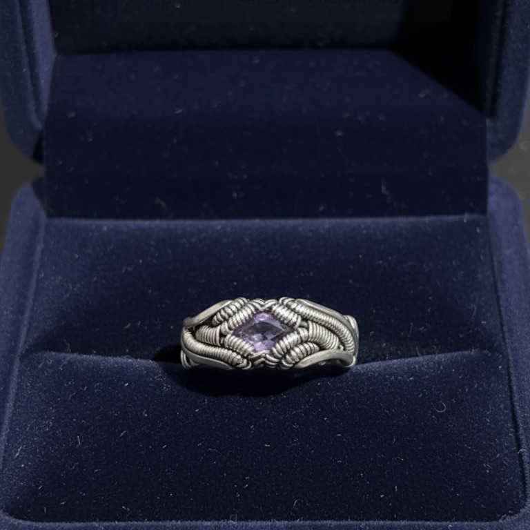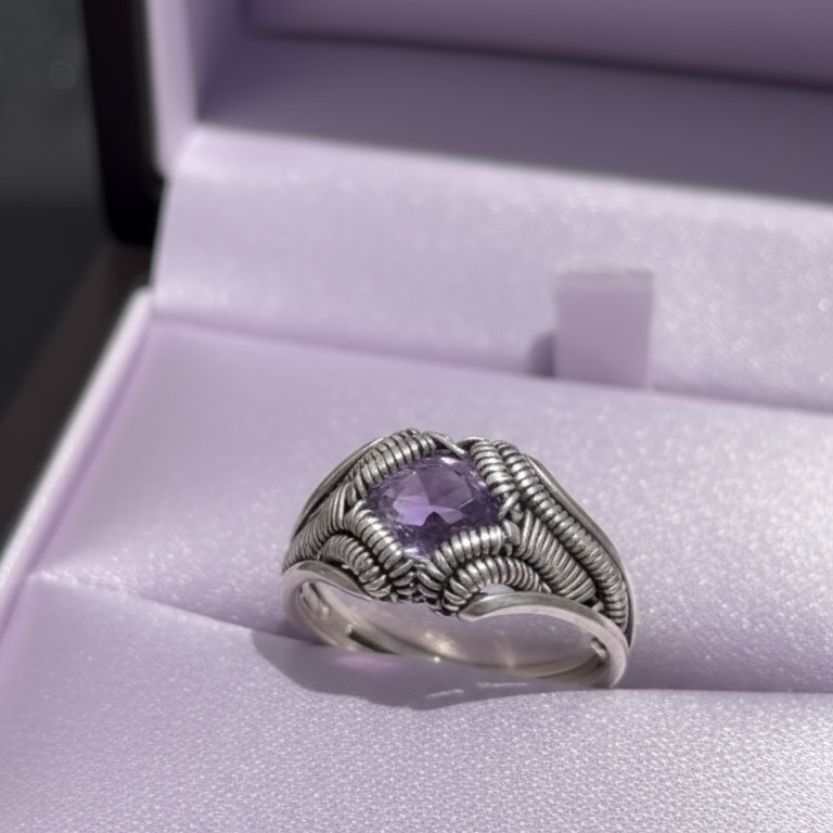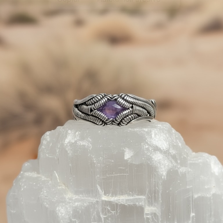 Feito à mão em prata 950, com ametista facetada natural. A Coleção Éteris representa o equilíbrio entre matéria e espírito. Design wirewrap artesanal e energia transcendental.