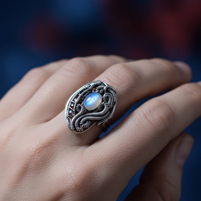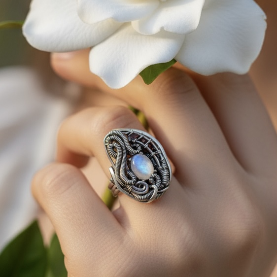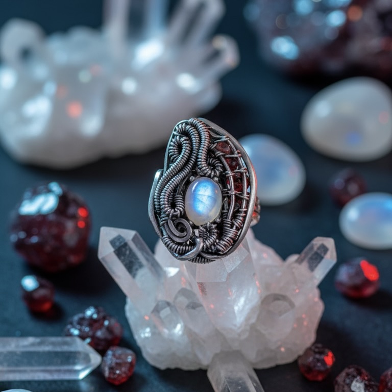 O anel Ascensus é desenvolvido em prata 950 com técnica de wirewrap avançada, apresentando estrutura reforçada e simetria precisa. A peça central traz pedra da lua cabochão com 5 granadas facetadas, selecionada pela qualidade e características ópticas únicas. A Coleção Ascensus simboliza a elevação técnica e estética do design wirewrap, onde cada fio é tensionado manualmente para moldar uma estrutura que protege e valoriza a pedra. As propriedades naturais de pedra da lua cabochão com 5 granadas facetadas complementam a proposta da coleção, unindo resistência, harmonia e expressão energética.