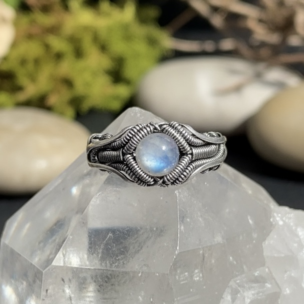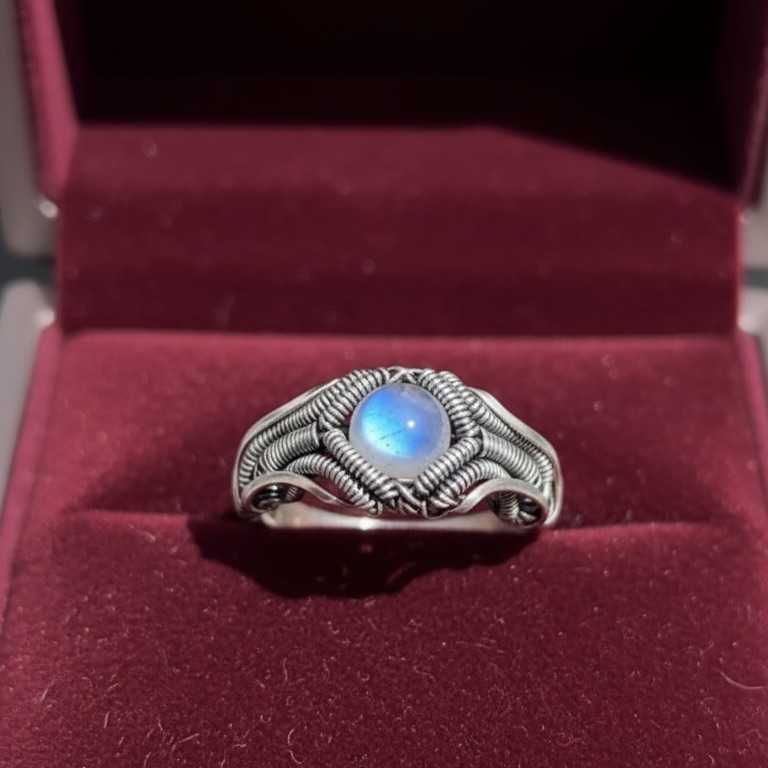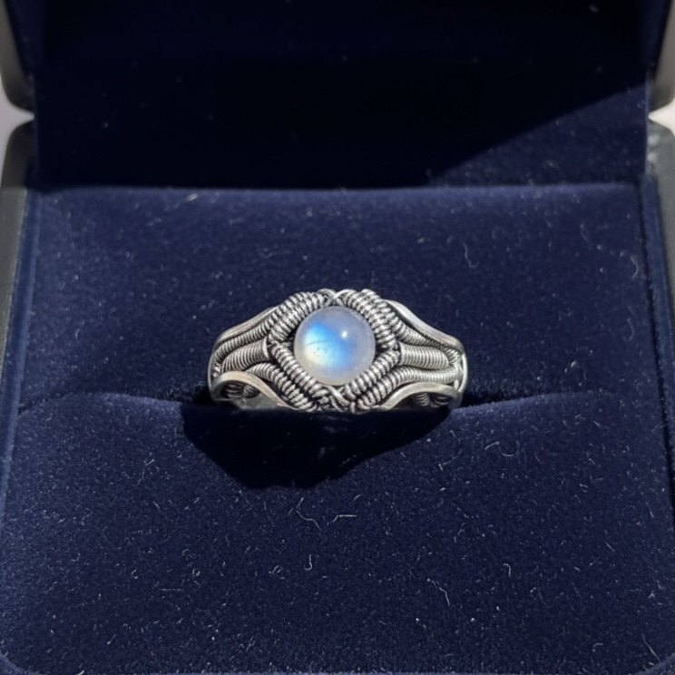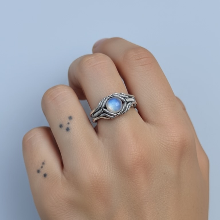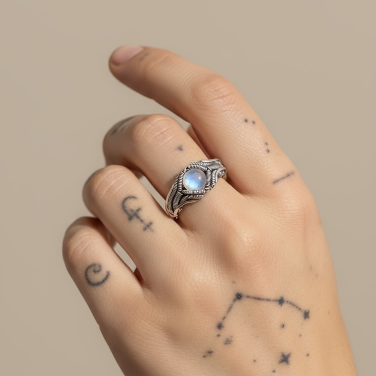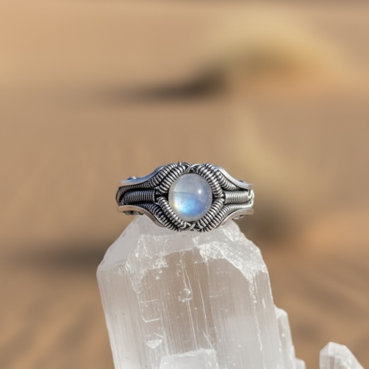 Forjado em prata 950 pela técnica Wire Wrap, ele envolve uma pedra da lua natural que reflete tons suaves e luminosos, evocando o brilho da noite e a sabedoria do inconsciente.