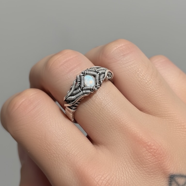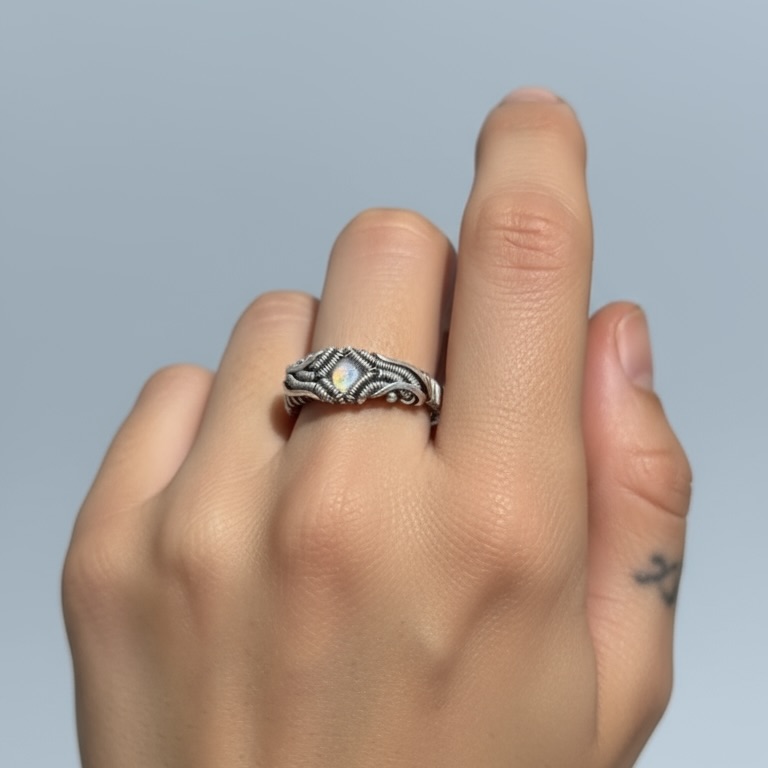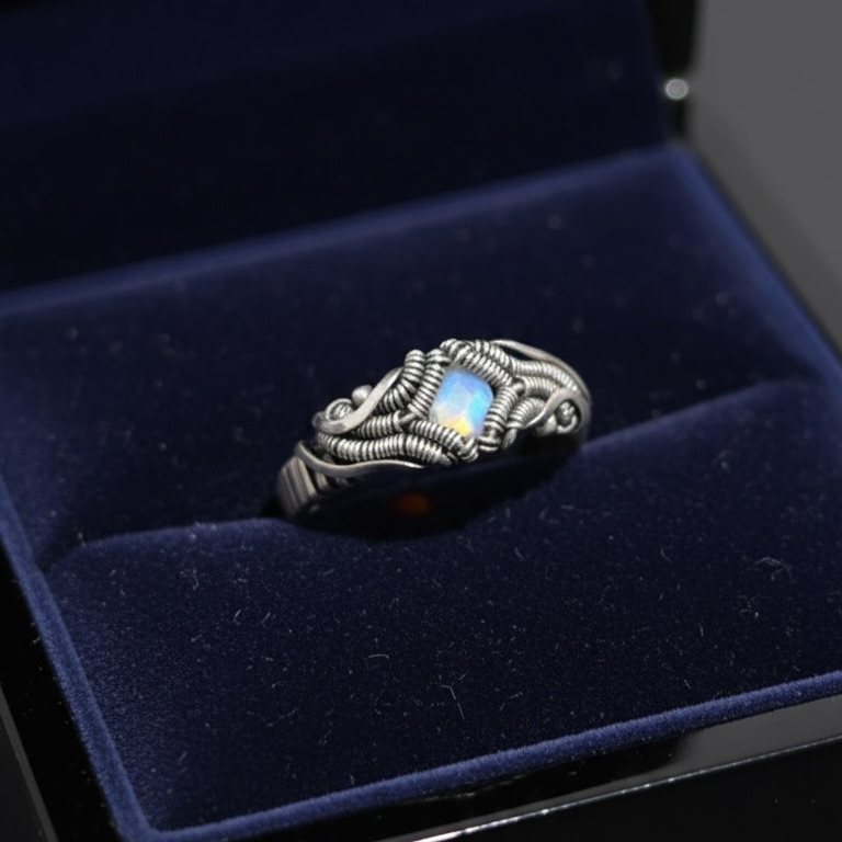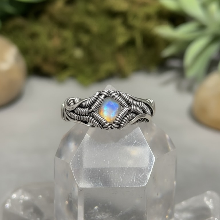 Feito à mão em prata 950, com pedra da lua facetada natural. A Coleção Éteris representa o equilíbrio entre matéria e espírito. Design wirewrap artesanal e energia transcendental.