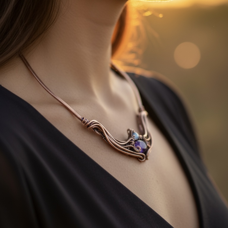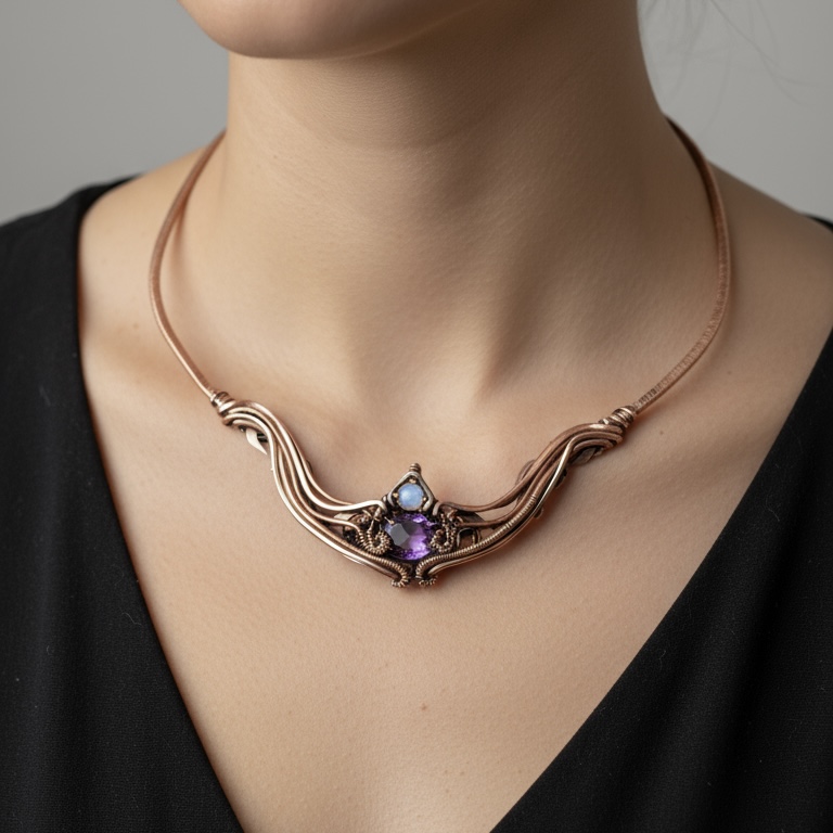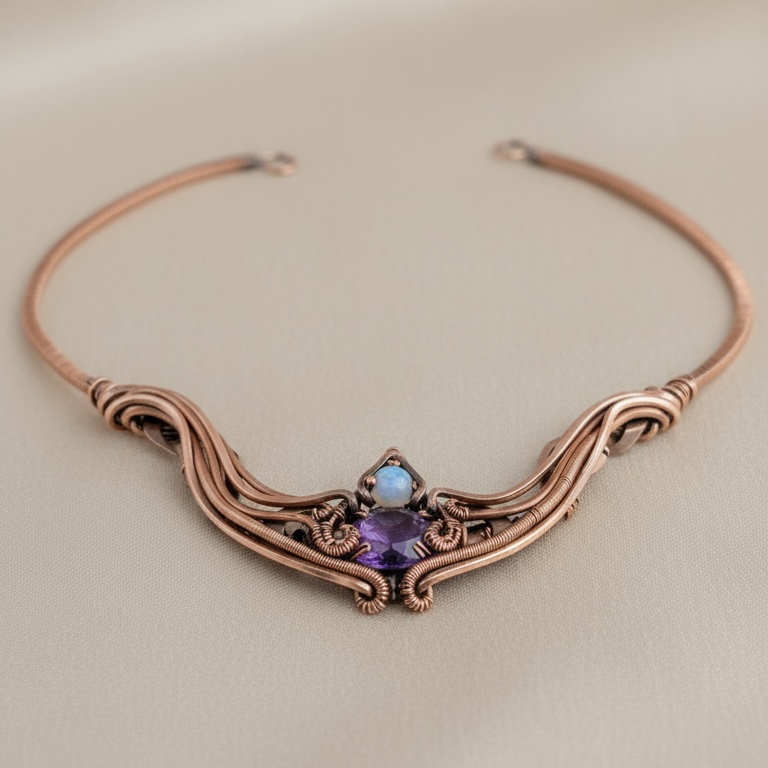 Gargantilha de cobre puro com ametista e pedra da lua — uma joia feita para mulheres que vibram entre a força e a sensibilidade.