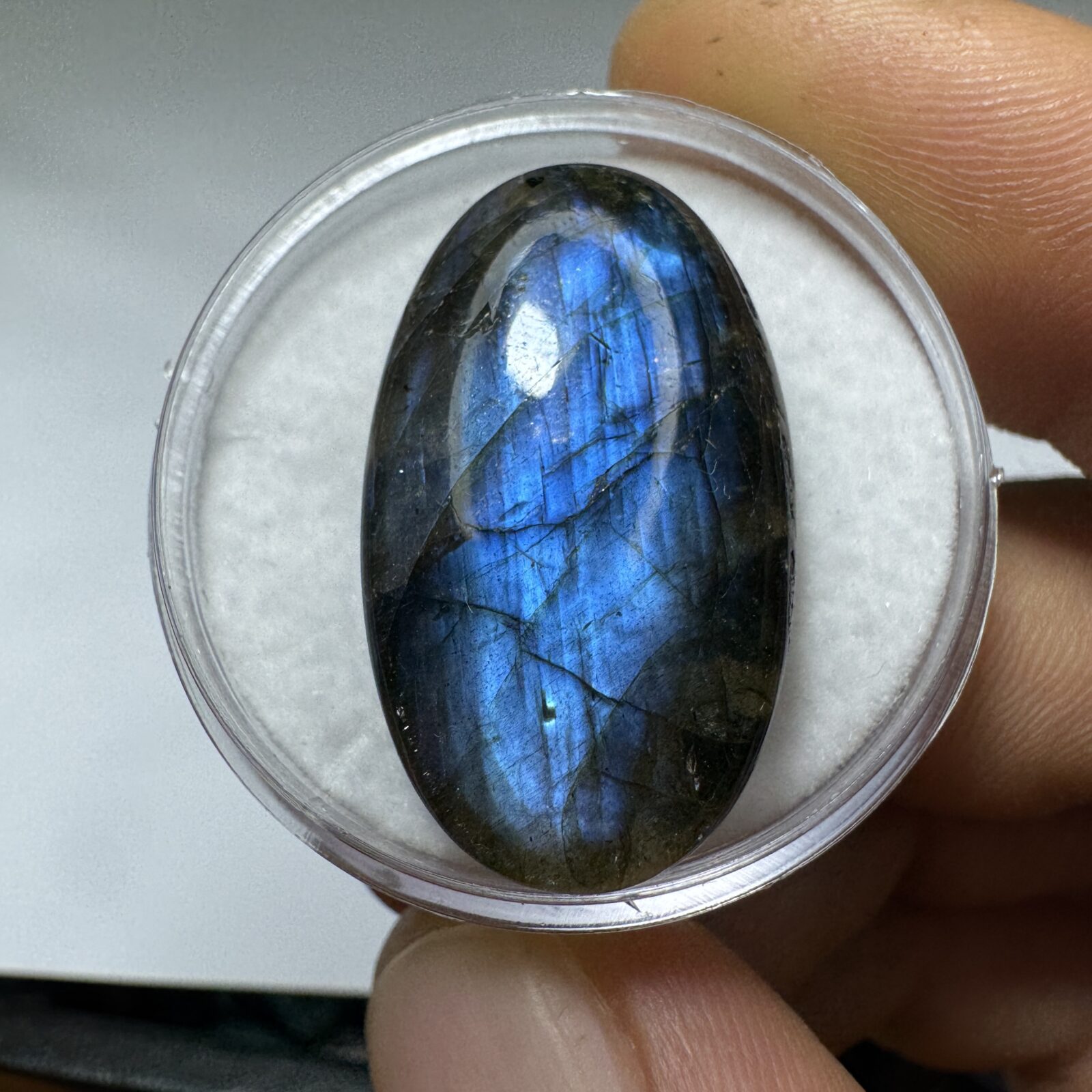 Labradorita natural em cabochão, com iridescência variável (flashes azuis, verdes e dourados). Peças selecionadas com boa transparência opaca a translúcida e polimento uniforme. Ideal para joias com destaque de brilho labradorescente.