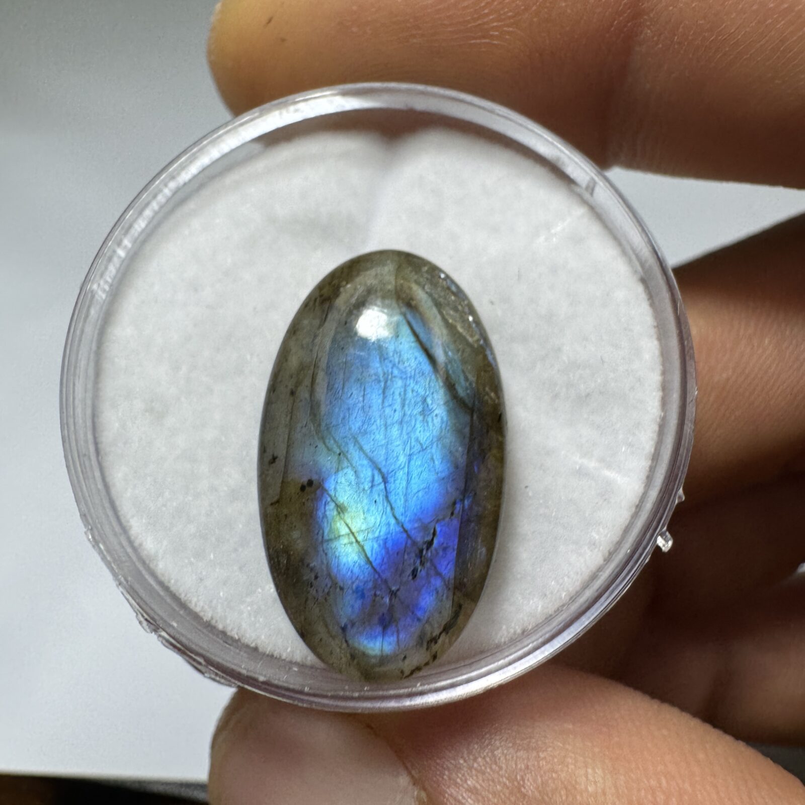 Labradorita natural em cabochão, com iridescência variável (flashes azuis, verdes e dourados). Peças selecionadas com boa transparência opaca a translúcida e polimento uniforme. Ideal para joias com destaque de brilho labradorescente.