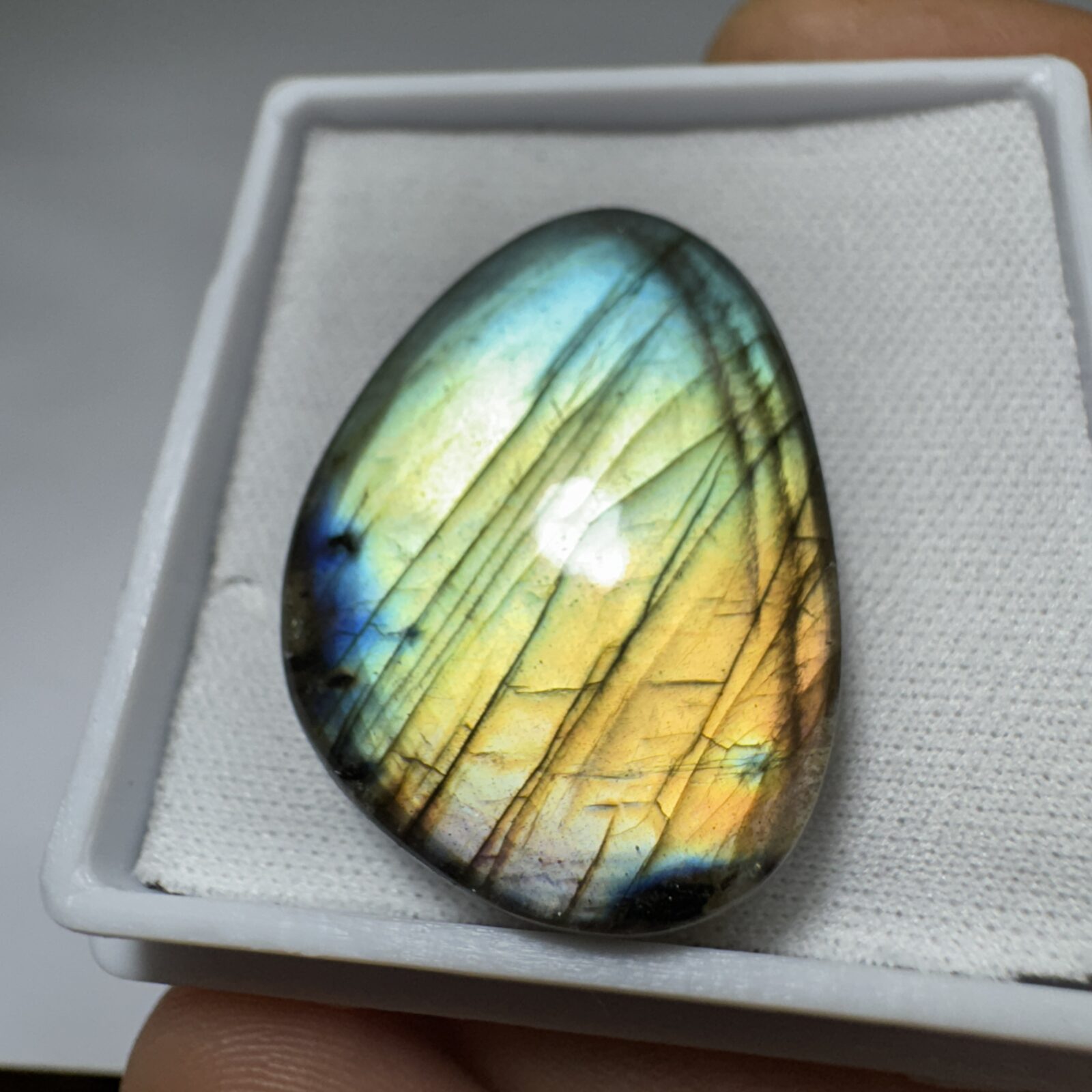 Labradorita natural em cabochão, com iridescência variável (flashes azuis, verdes e dourados). Peças selecionadas com boa transparência opaca a translúcida e polimento uniforme. Ideal para joias com destaque de brilho labradorescente.