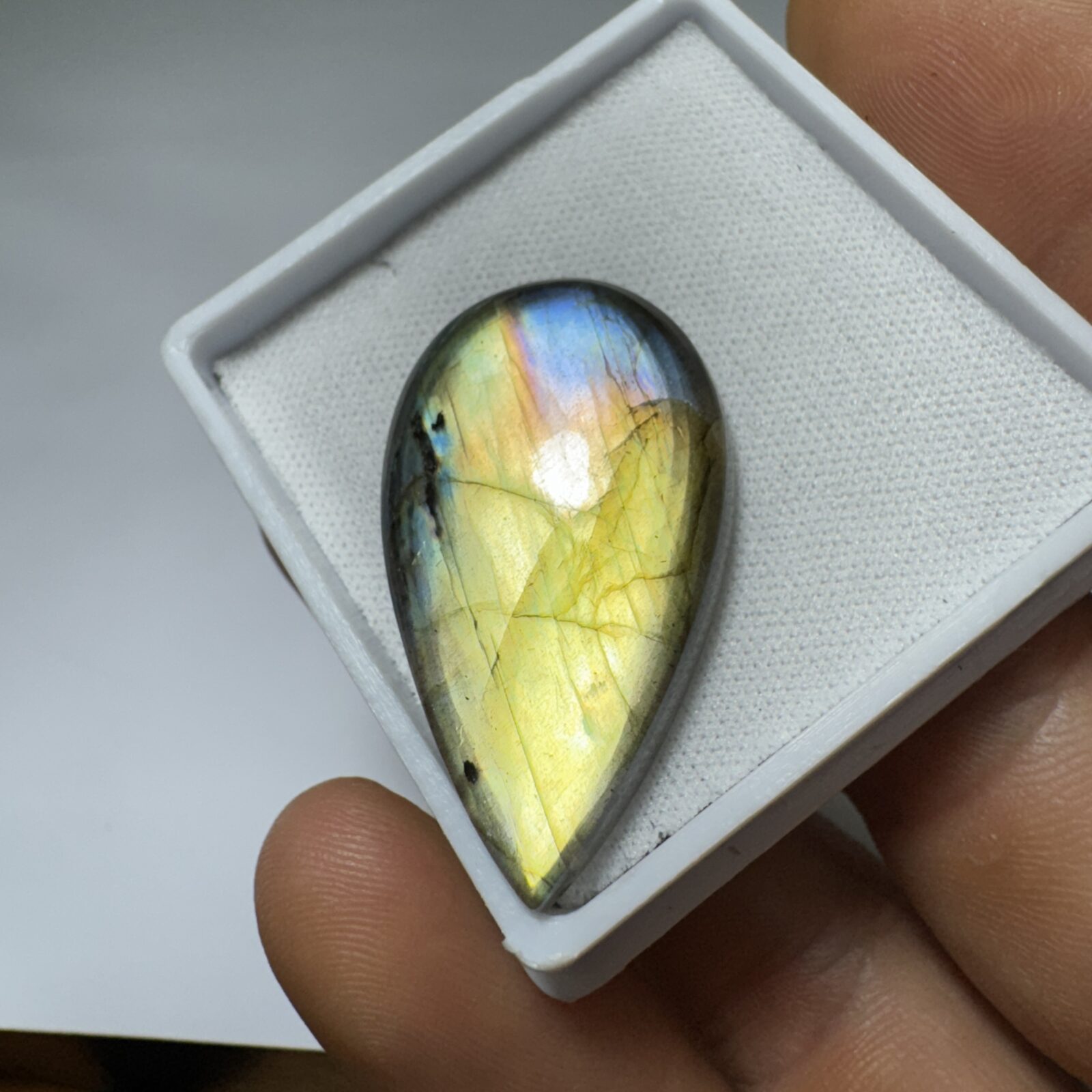 Labradorita natural em cabochão, com iridescência variável (flashes azuis, verdes e dourados). Peças selecionadas com boa transparência opaca a translúcida e polimento uniforme. Ideal para joias com destaque de brilho labradorescente.