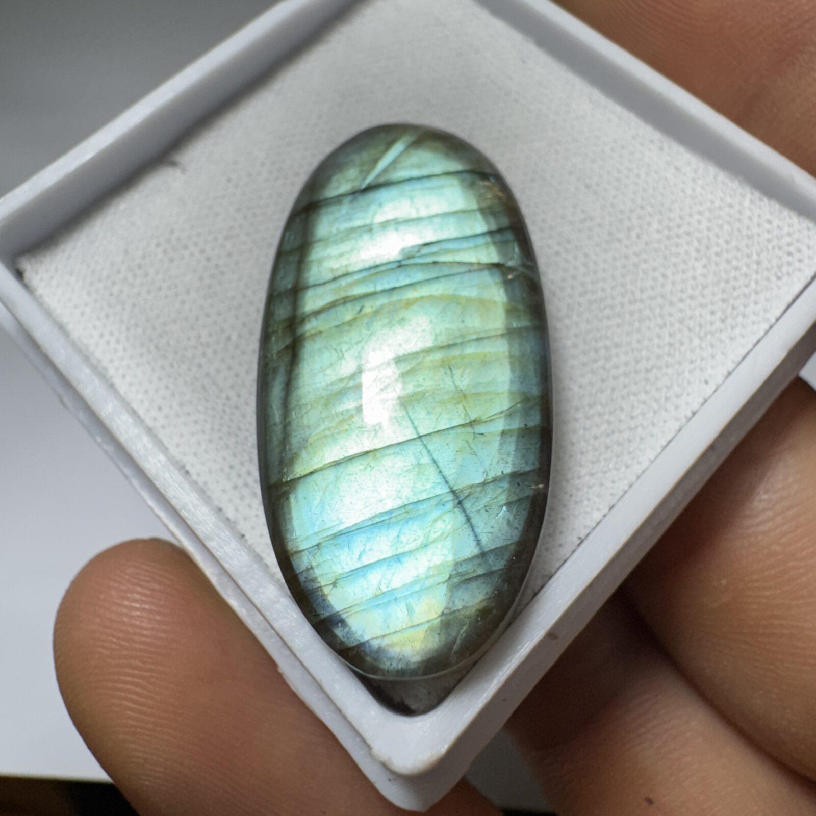 Labradorita natural em cabochão, com iridescência variável (flashes azuis, verdes e dourados). Peças selecionadas com boa transparência opaca a translúcida e polimento uniforme. Ideal para joias com destaque de brilho labradorescente.