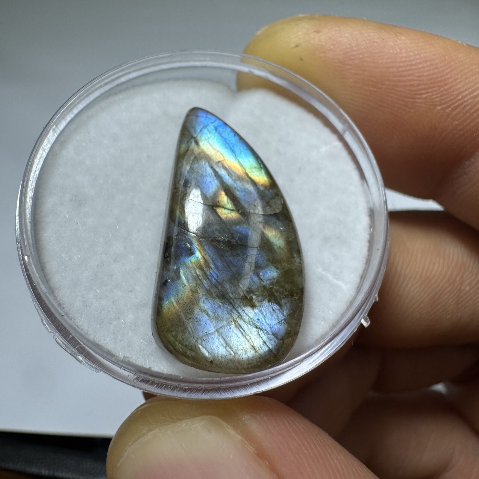 Labradorita natural em cabochão, com iridescência variável (flashes azuis, verdes e dourados). Peças selecionadas com boa transparência opaca a translúcida e polimento uniforme. Ideal para joias com destaque de brilho labradorescente.