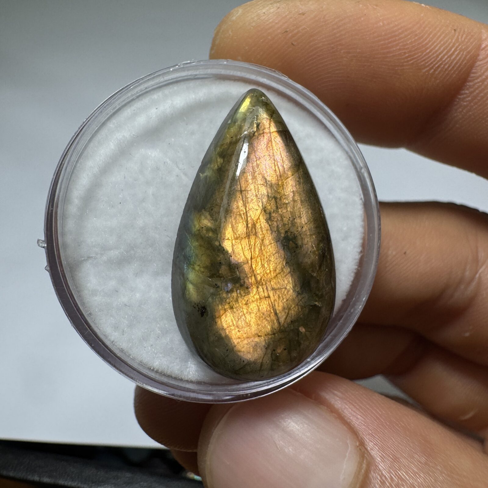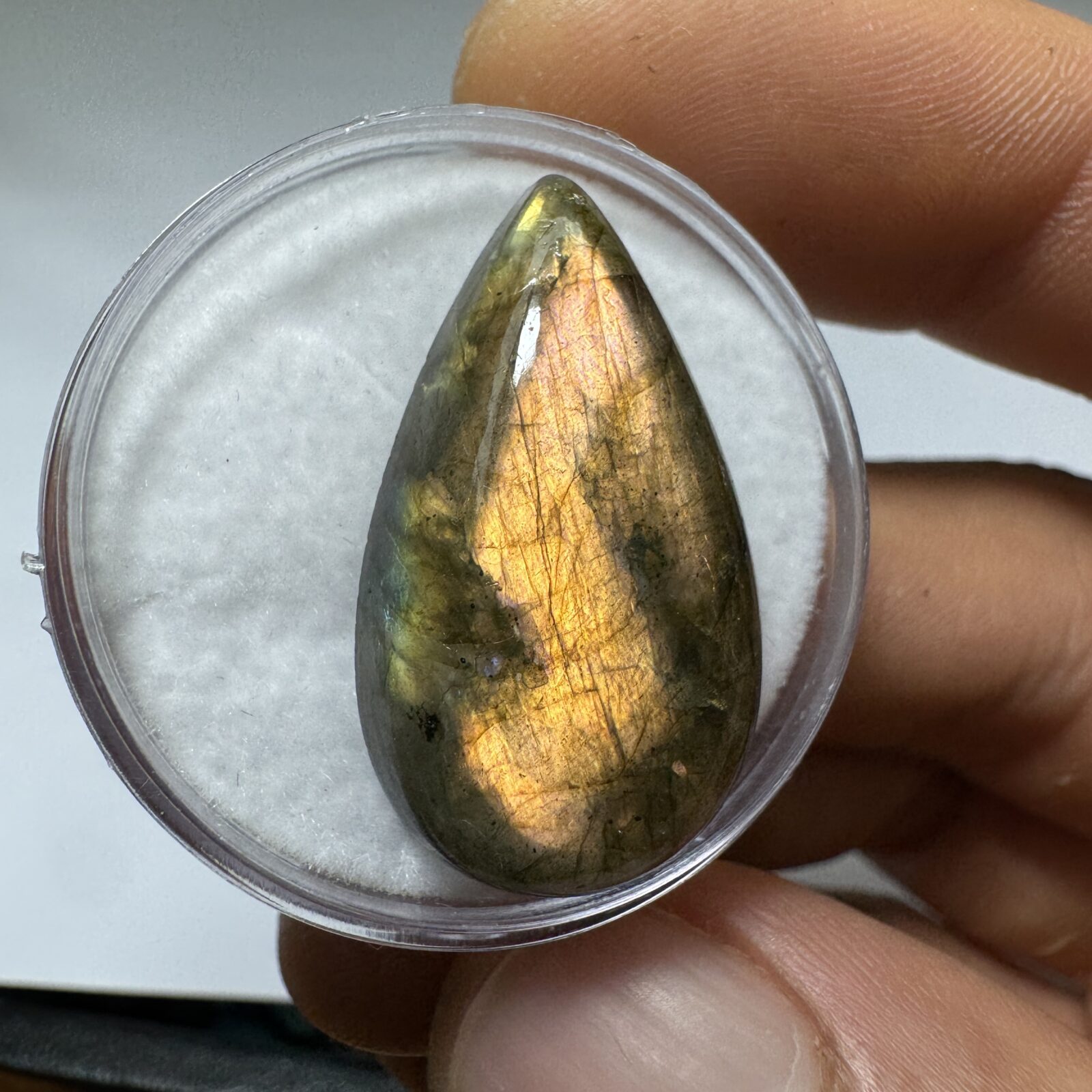 Labradorita natural em cabochão, com iridescência variável (flashes azuis, verdes e dourados). Peças selecionadas com boa transparência opaca a translúcida e polimento uniforme. Ideal para joias com destaque de brilho labradorescente.