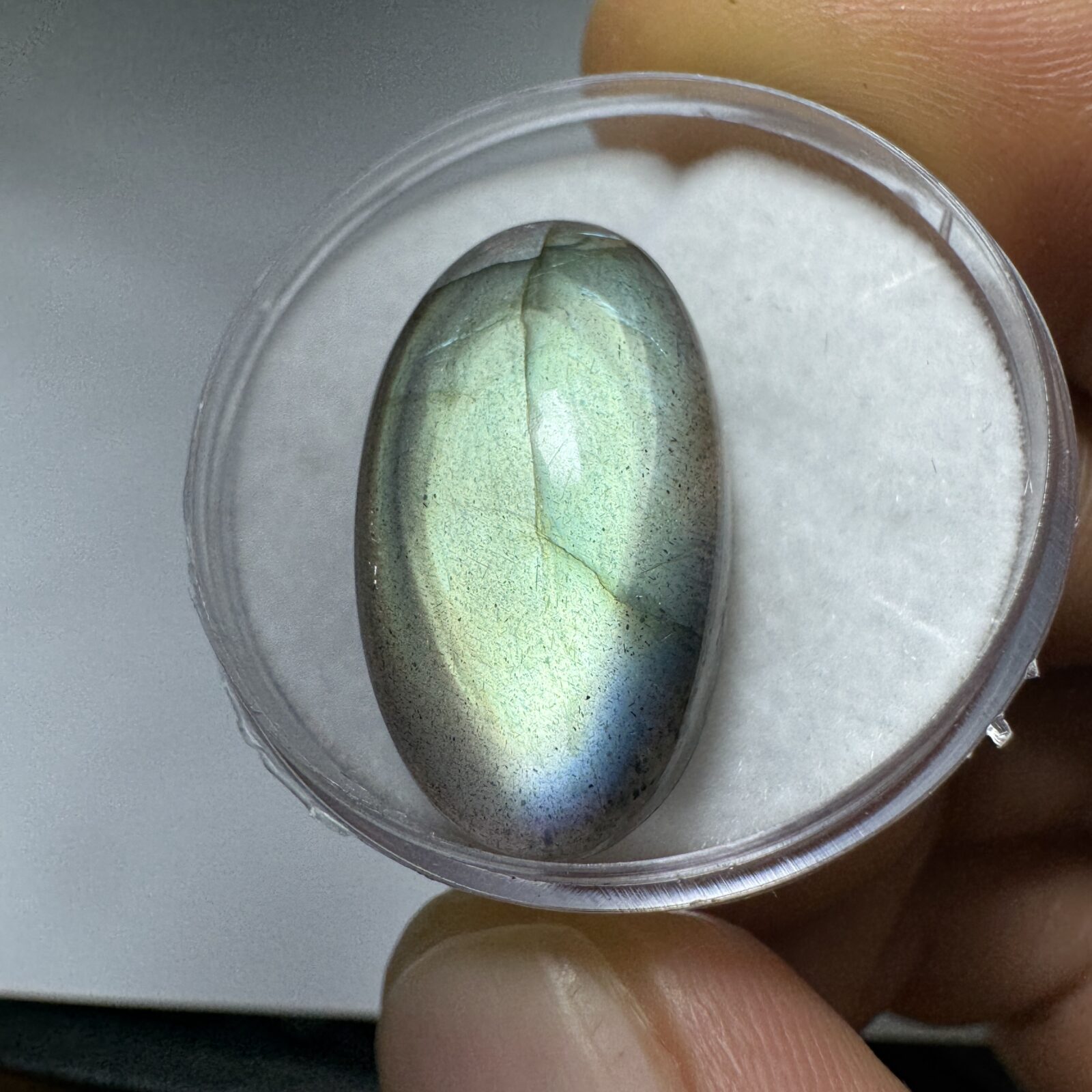 Labradorita natural em cabochão, com iridescência variável (flashes azuis, verdes e dourados). Peças selecionadas com boa transparência opaca a translúcida e polimento uniforme. Ideal para joias com destaque de brilho labradorescente.