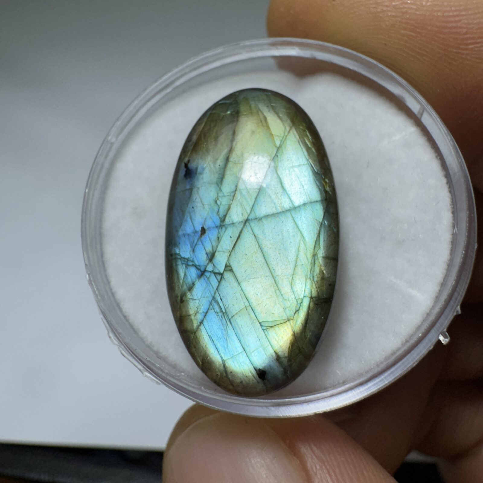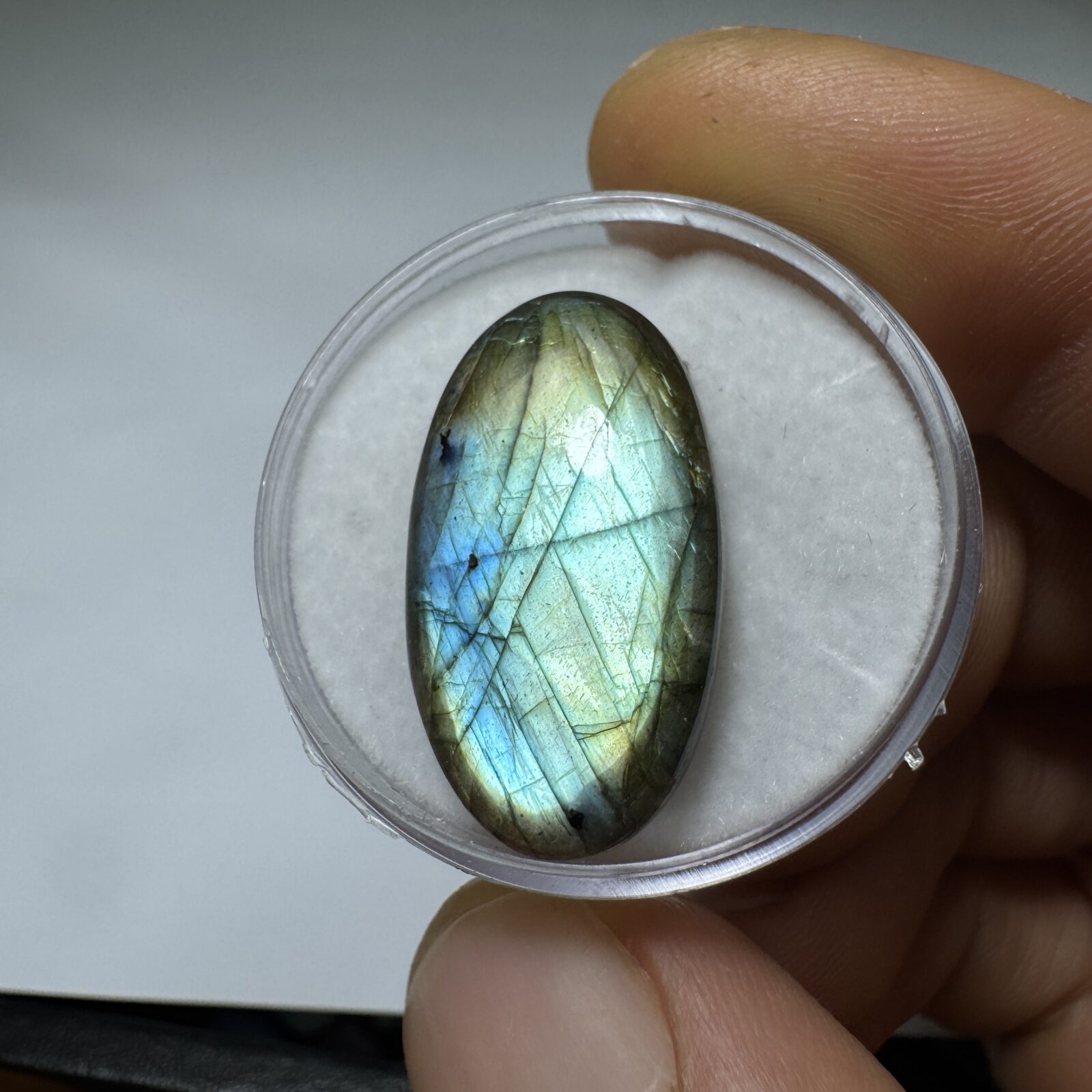 Labradorita natural em cabochão, com iridescência variável (flashes azuis, verdes e dourados). Peças selecionadas com boa transparência opaca a translúcida e polimento uniforme. Ideal para joias com destaque de brilho labradorescente.