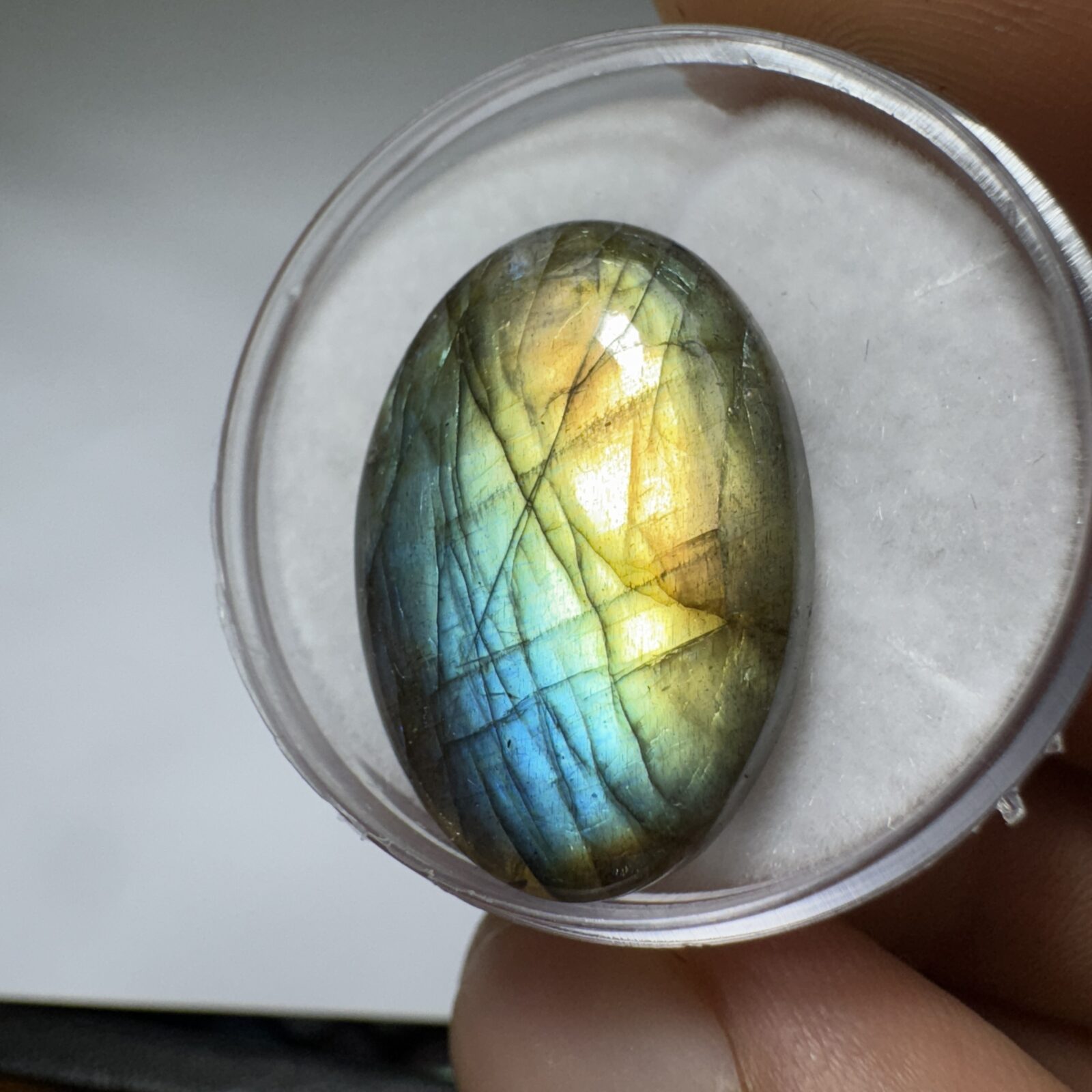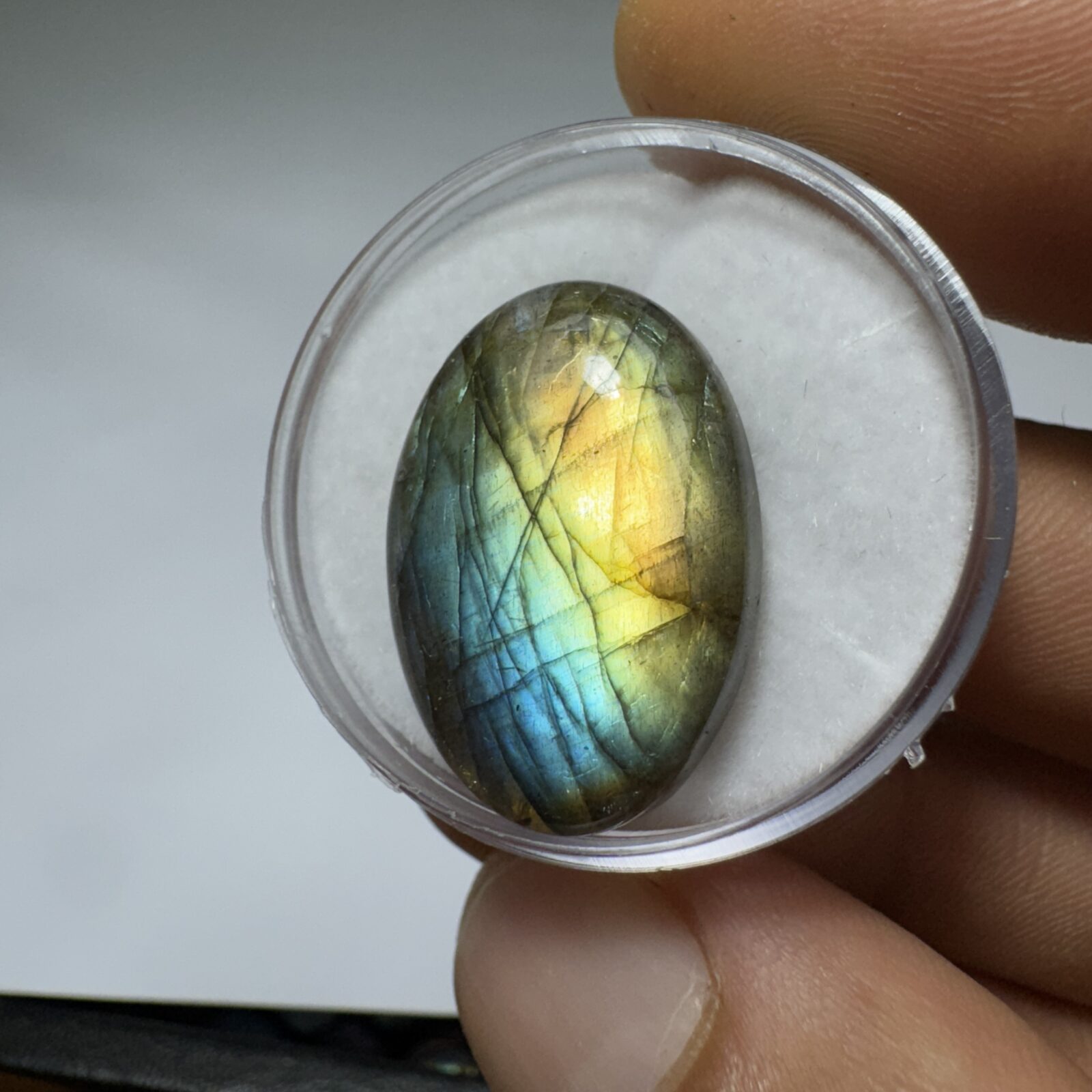Labradorita natural em cabochão, com iridescência variável (flashes azuis, verdes e dourados). Peças selecionadas com boa transparência opaca a translúcida e polimento uniforme. Ideal para joias com destaque de brilho labradorescente.