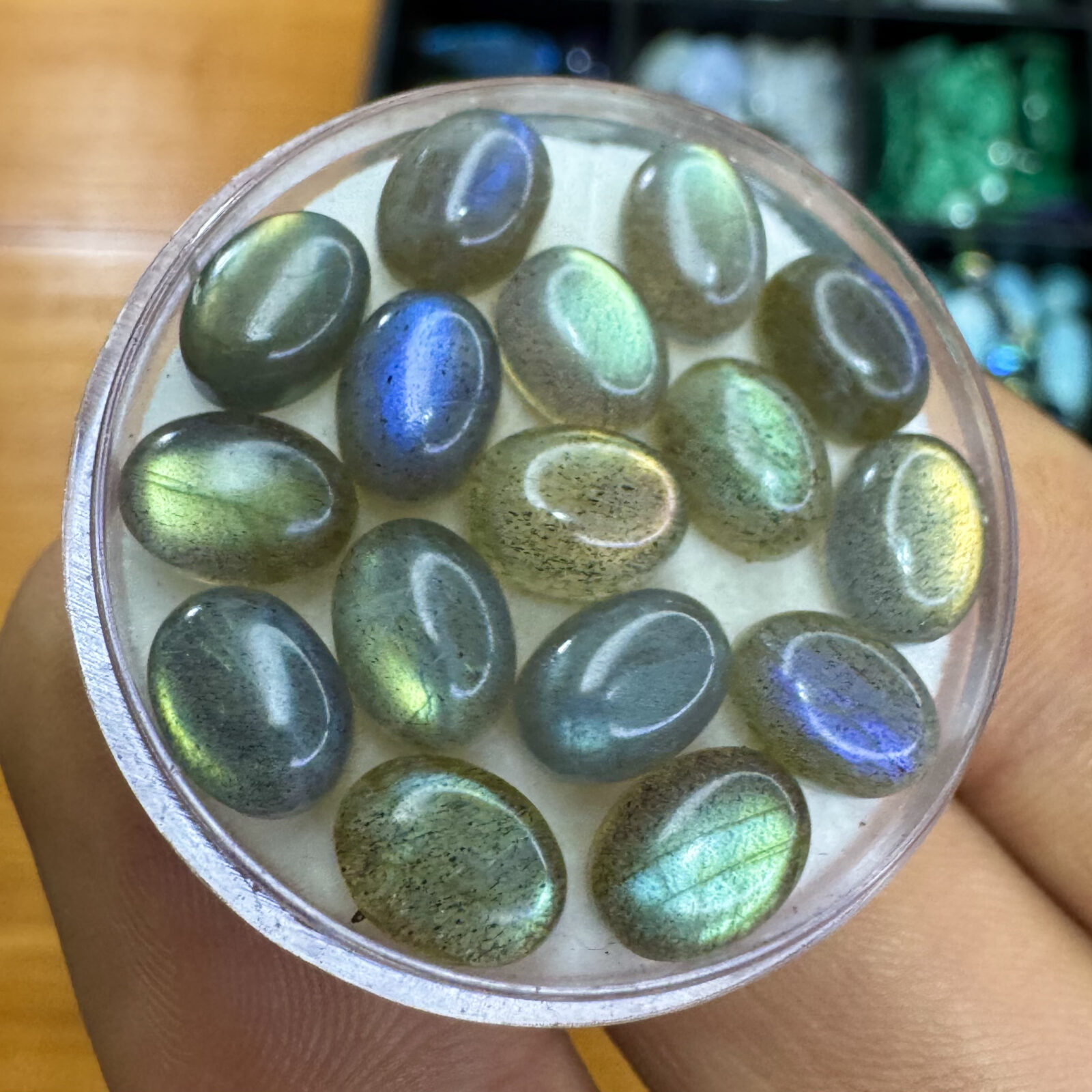 Labradorita cabochão com iridescência multicolor, polida e pronta para cravação.