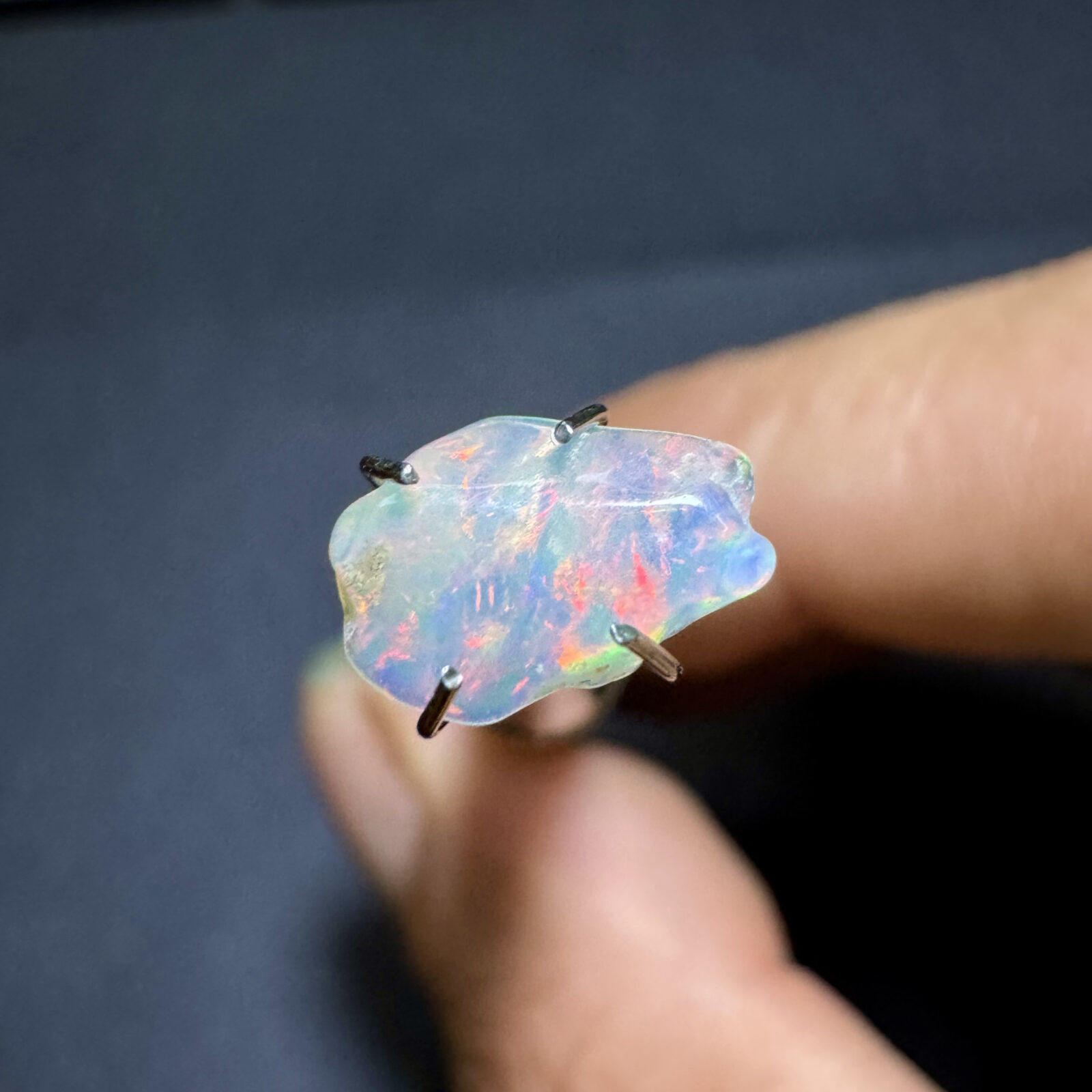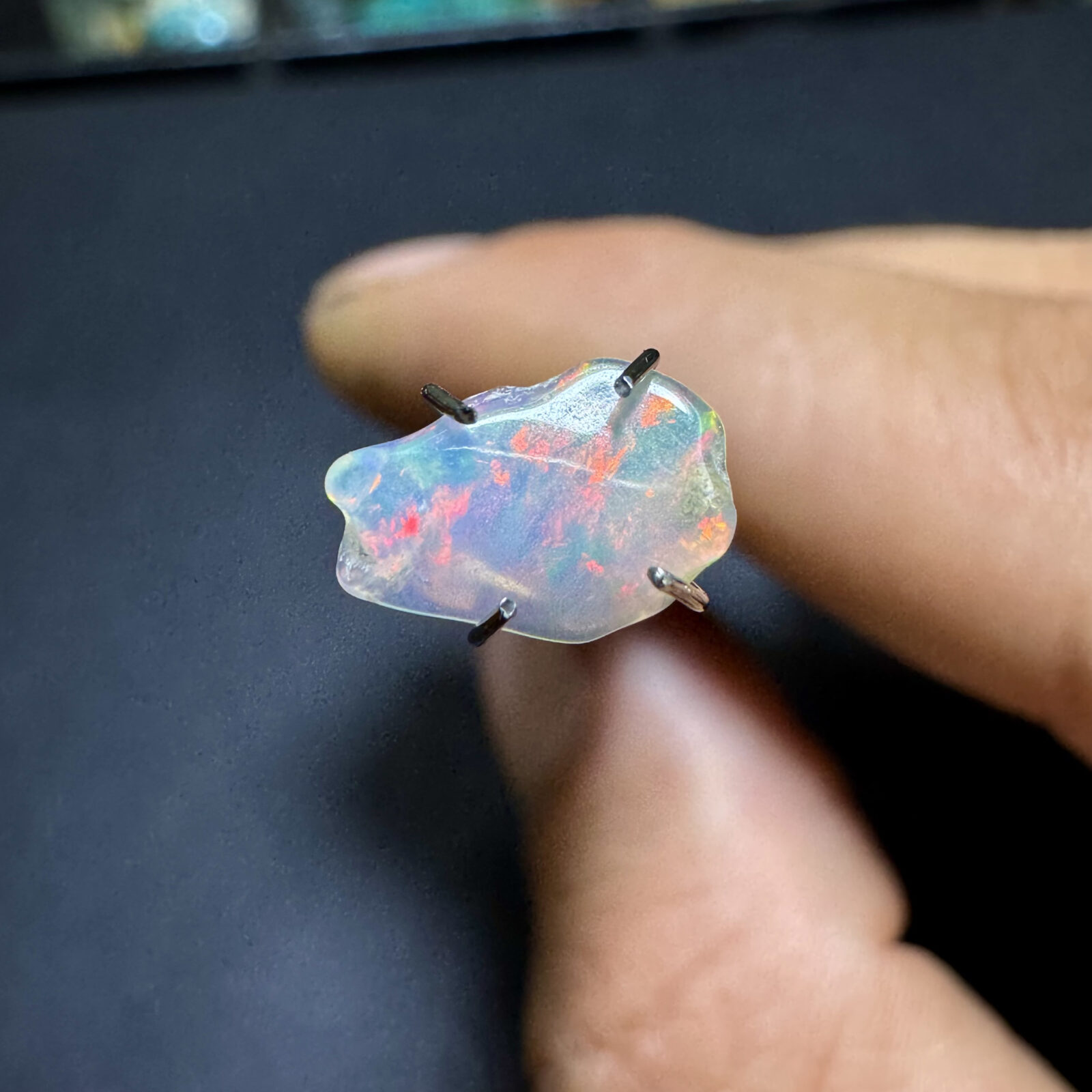 Opala natural bruta em estado original, com jogo de cores visível sob luz direta.