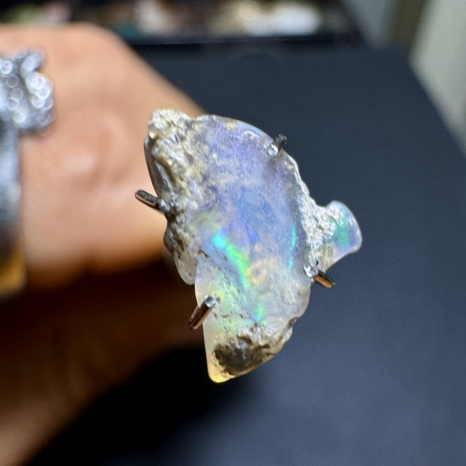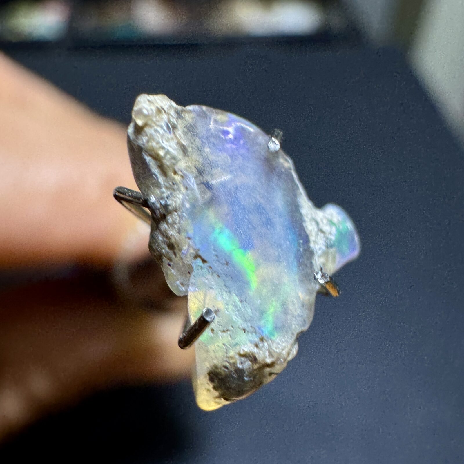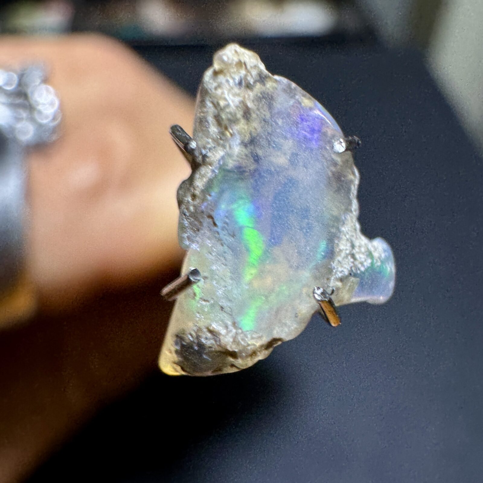 Opala natural bruta em estado original, com jogo de cores visível sob luz direta.