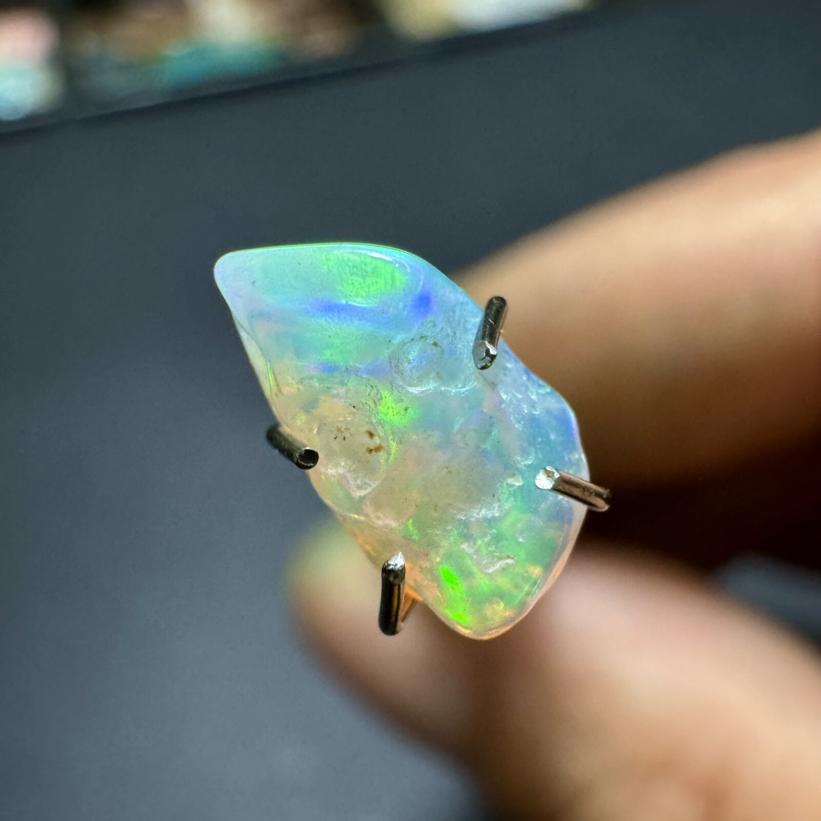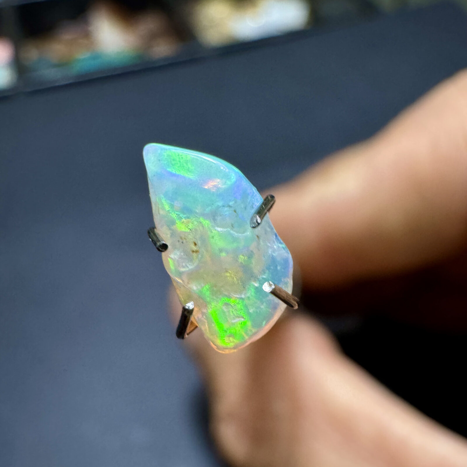 Opala natural bruta em estado original, com jogo de cores visível sob luz direta.