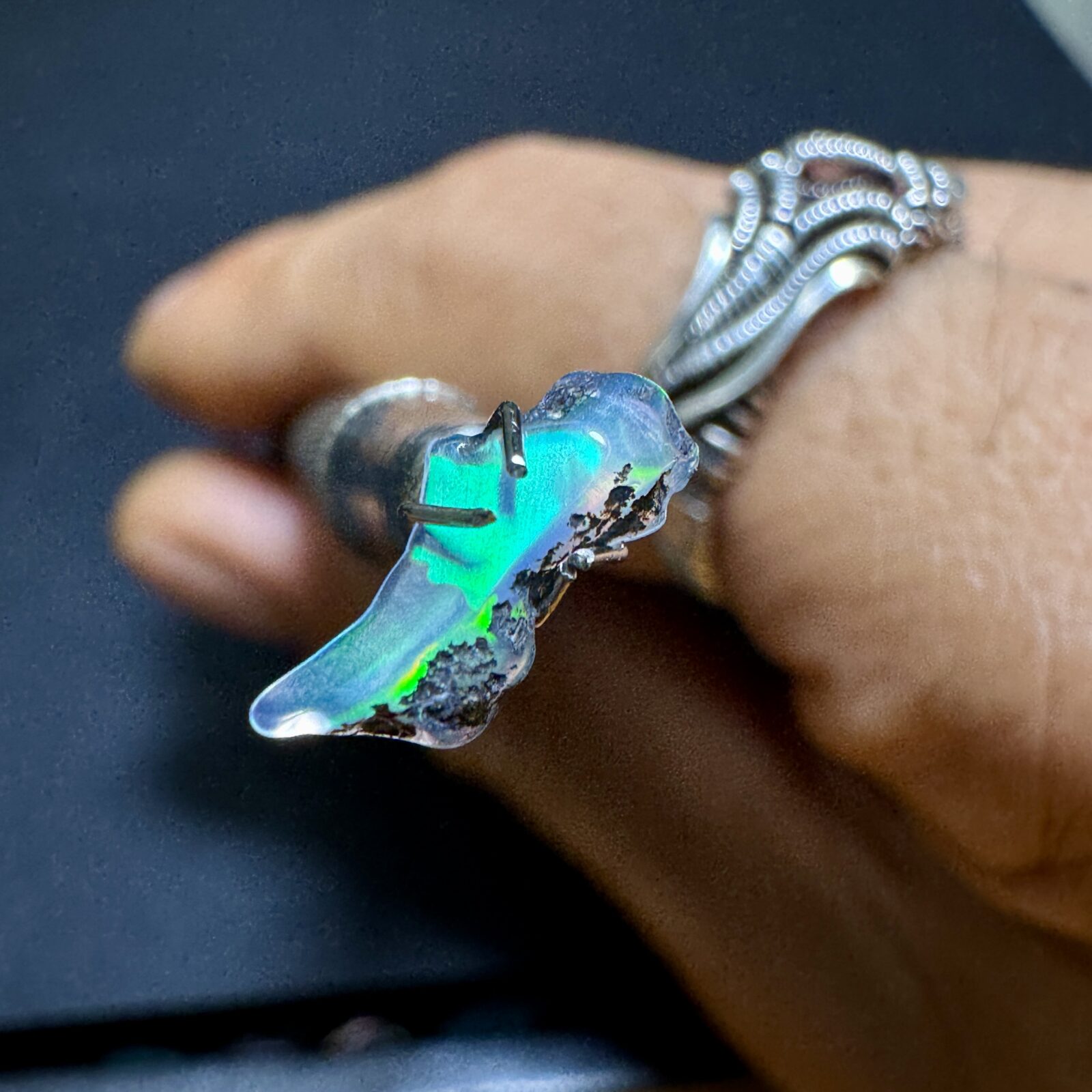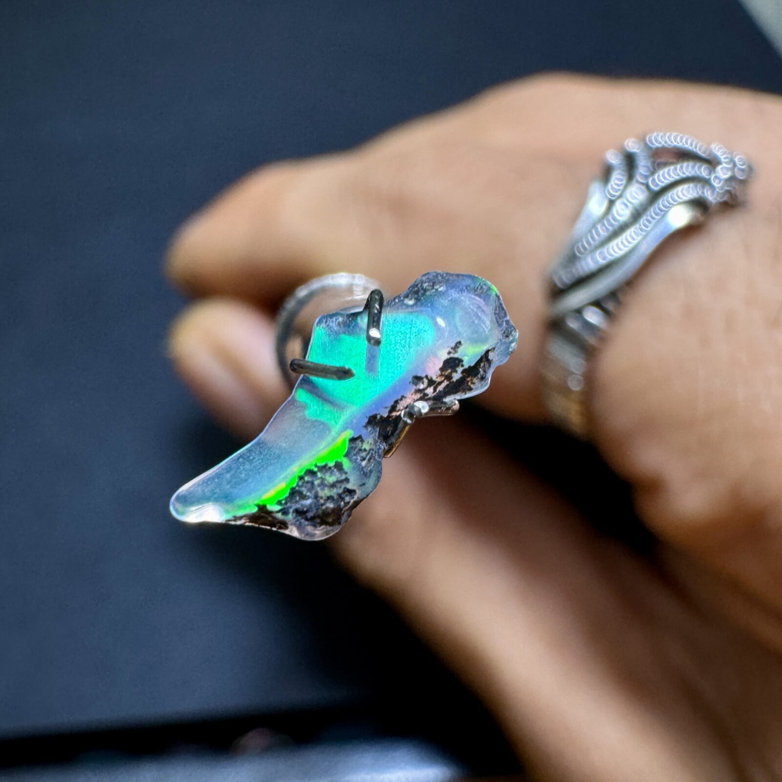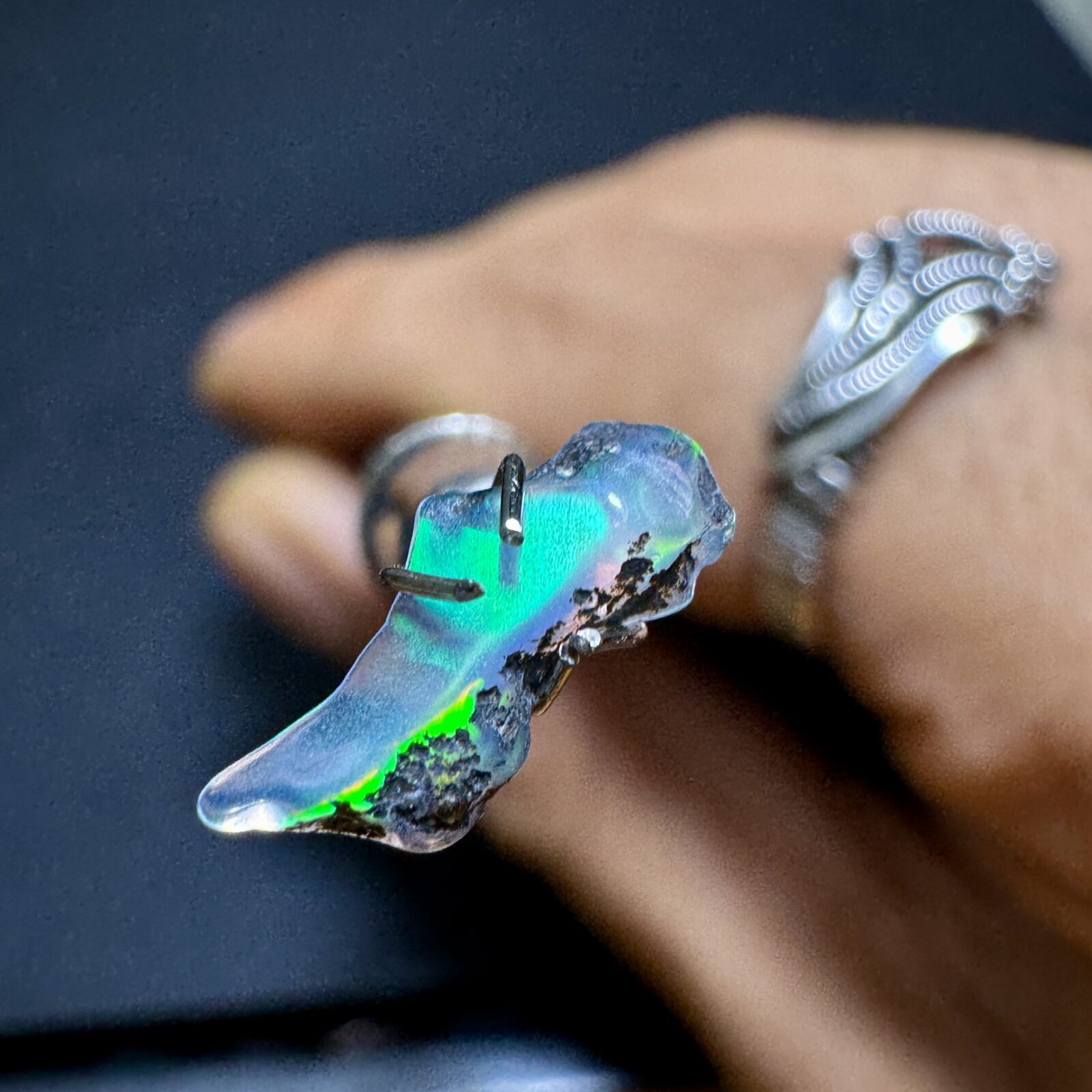Opala natural bruta em estado original, com jogo de cores visível sob luz direta.