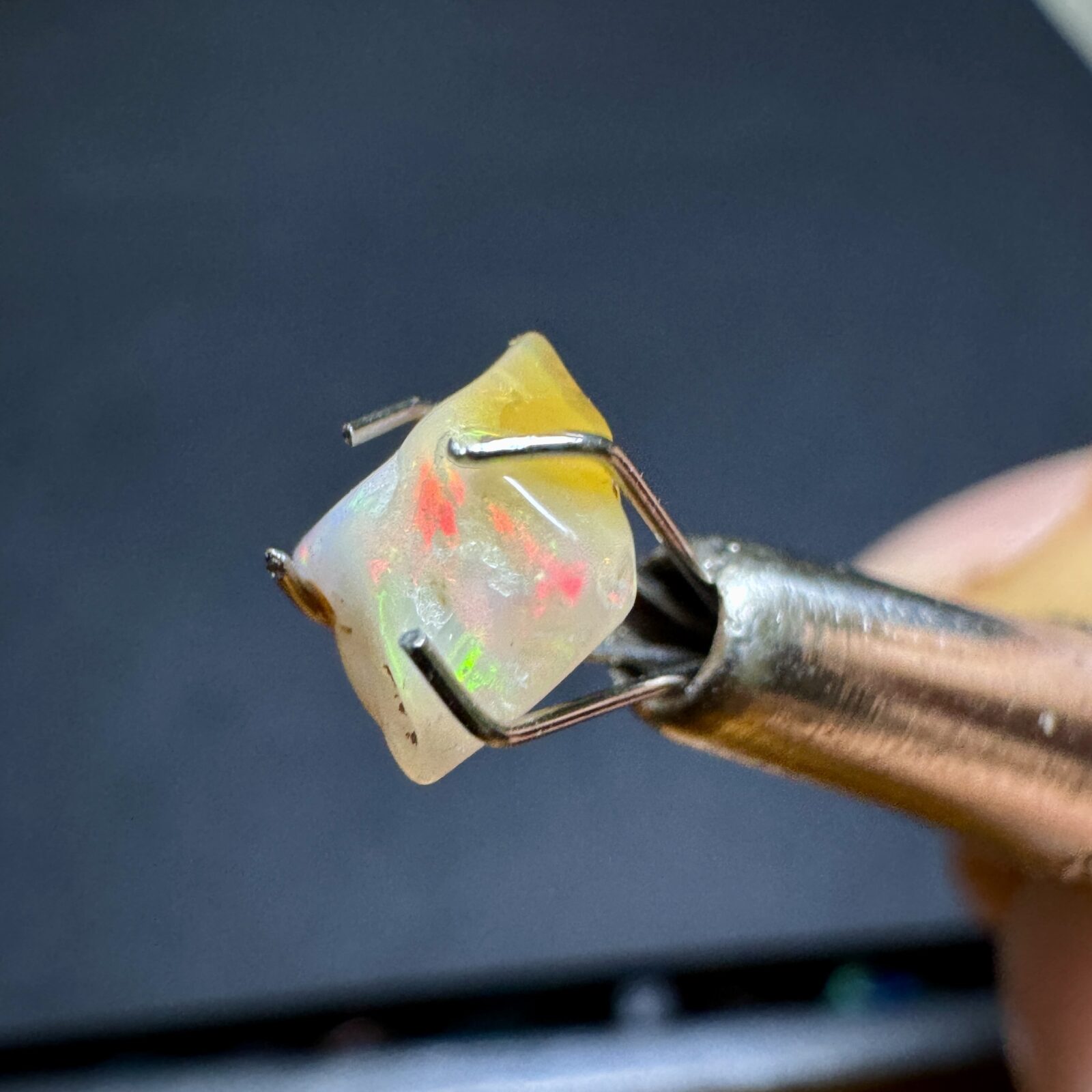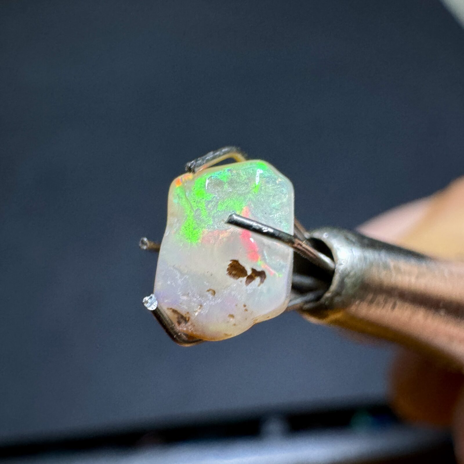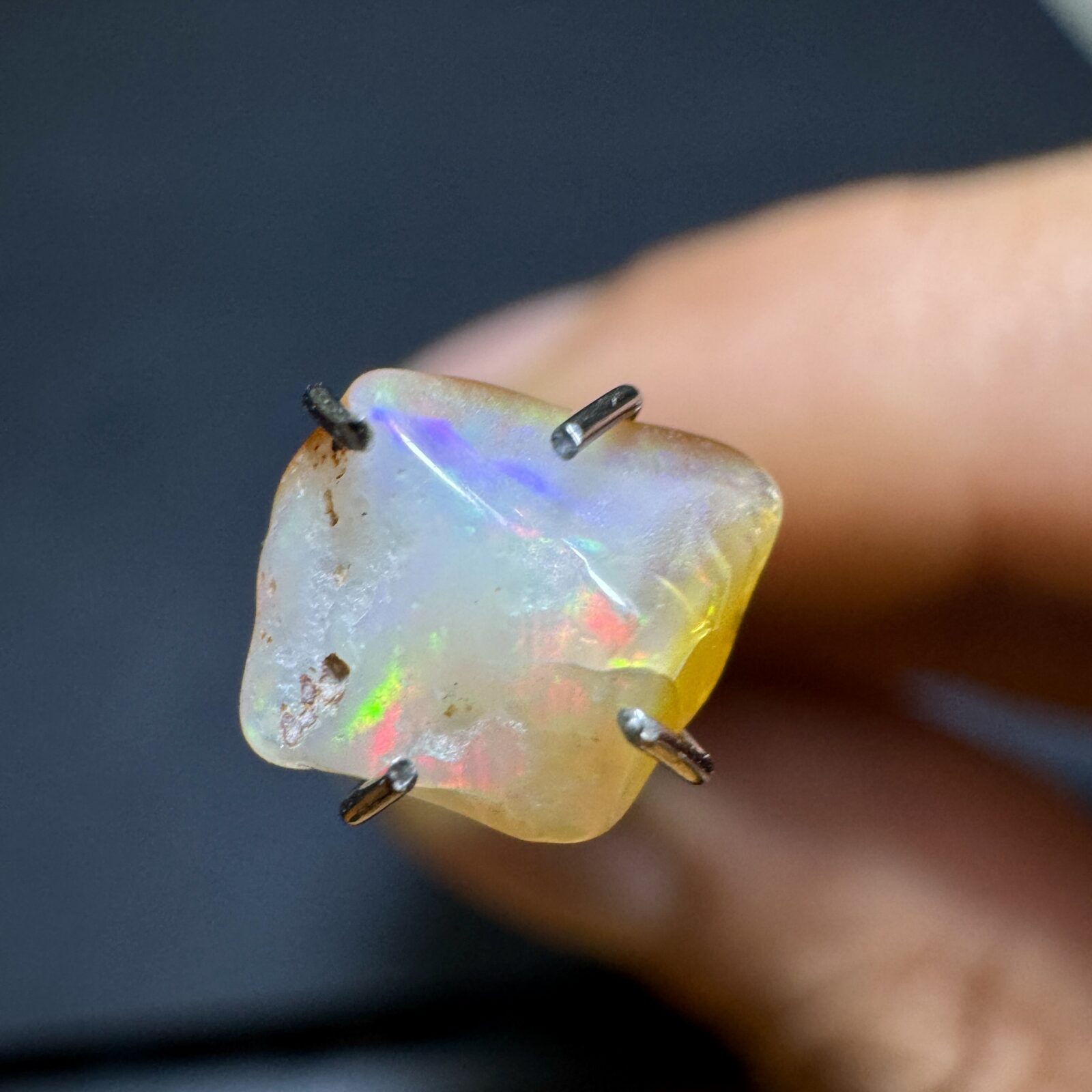 Opala natural bruta em estado original, com jogo de cores visível sob luz direta.
