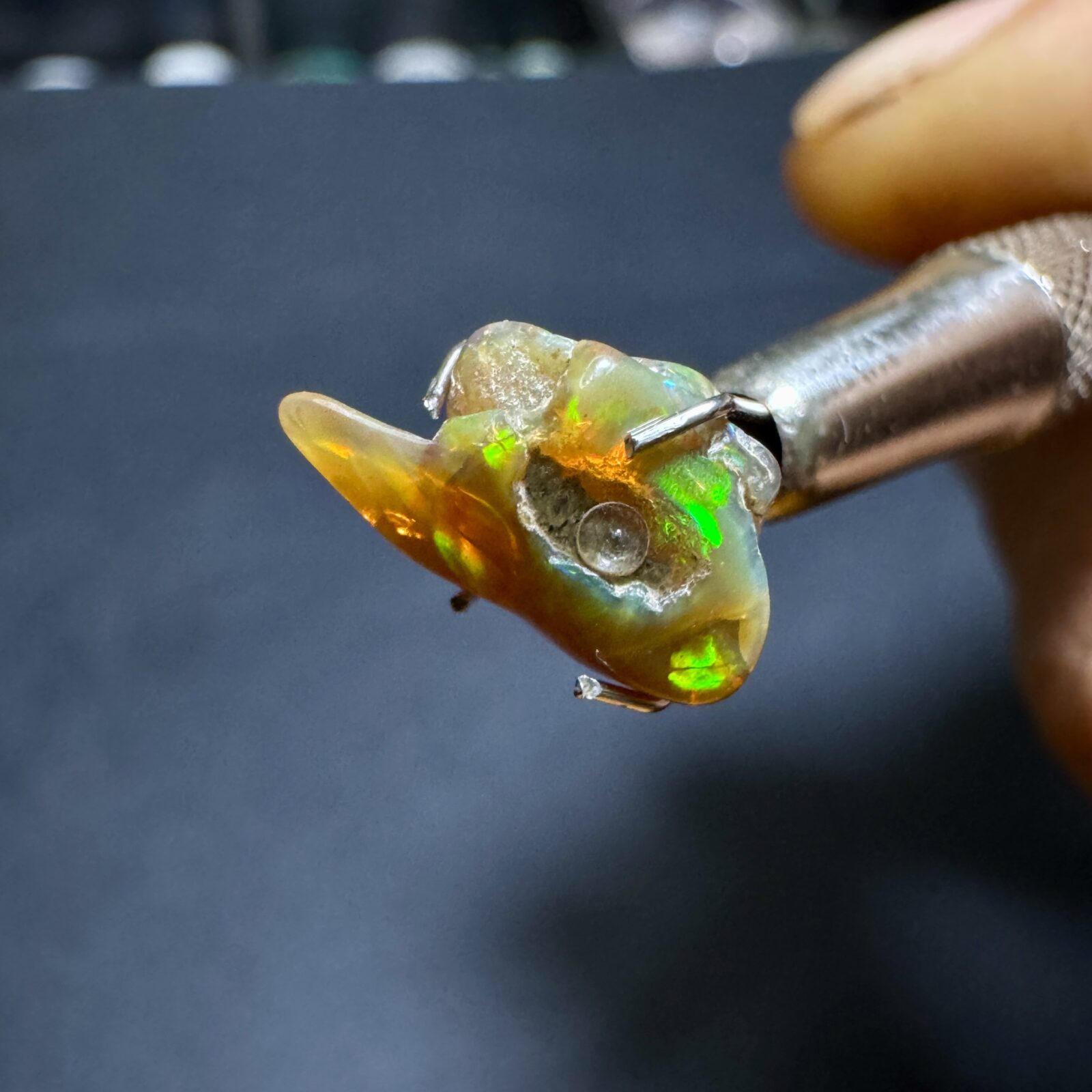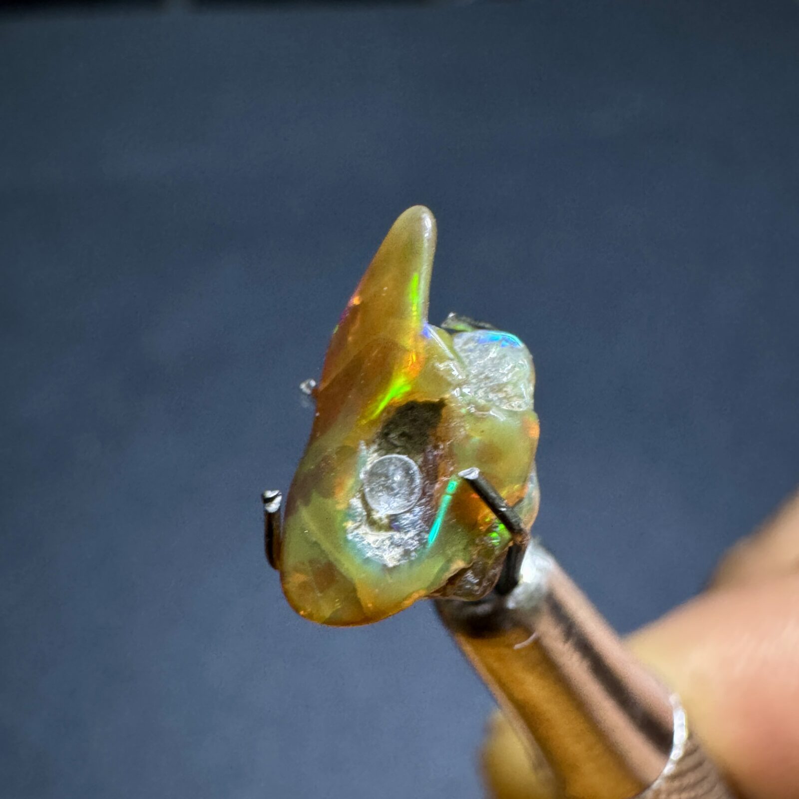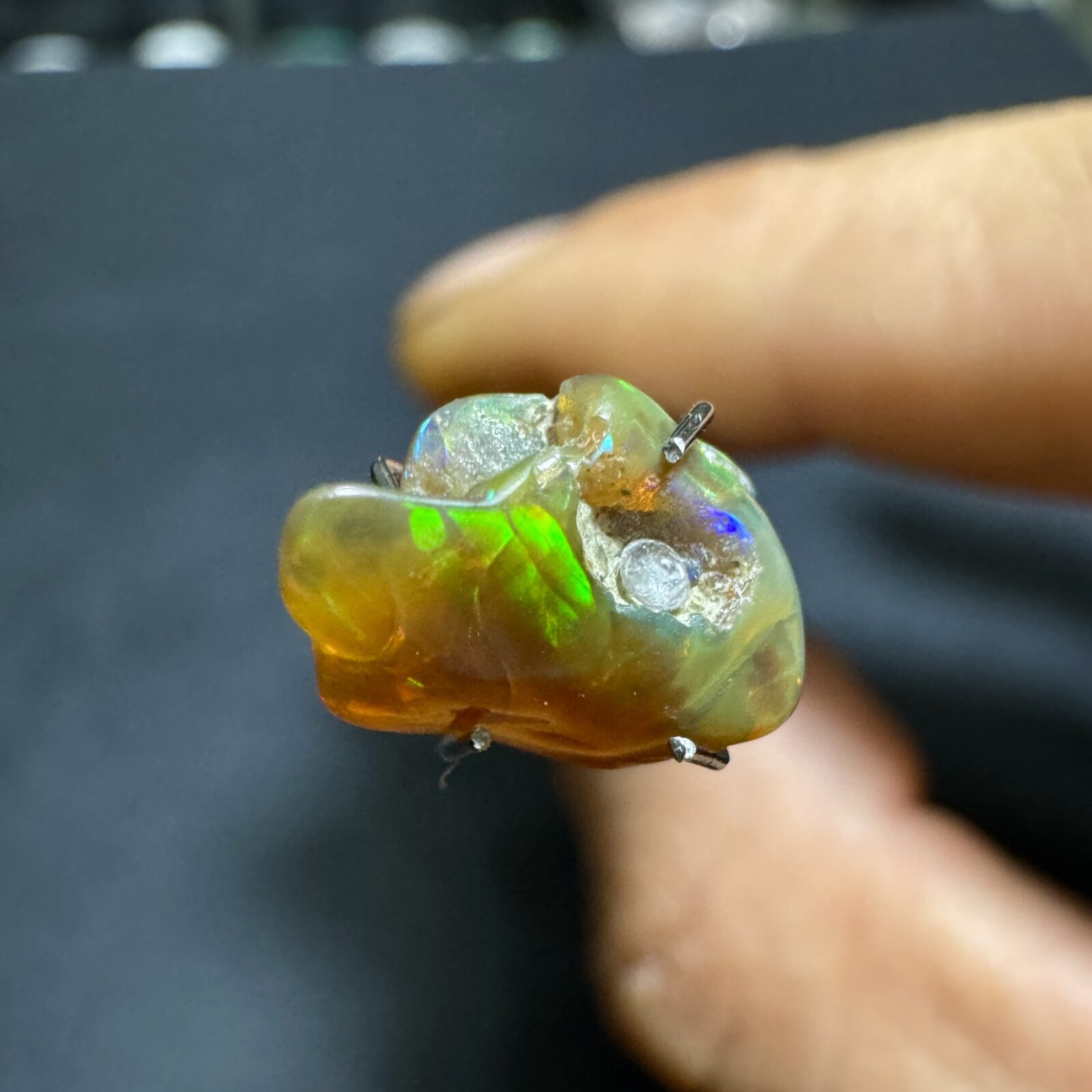 Opala natural bruta em estado original, com jogo de cores visível sob luz direta.