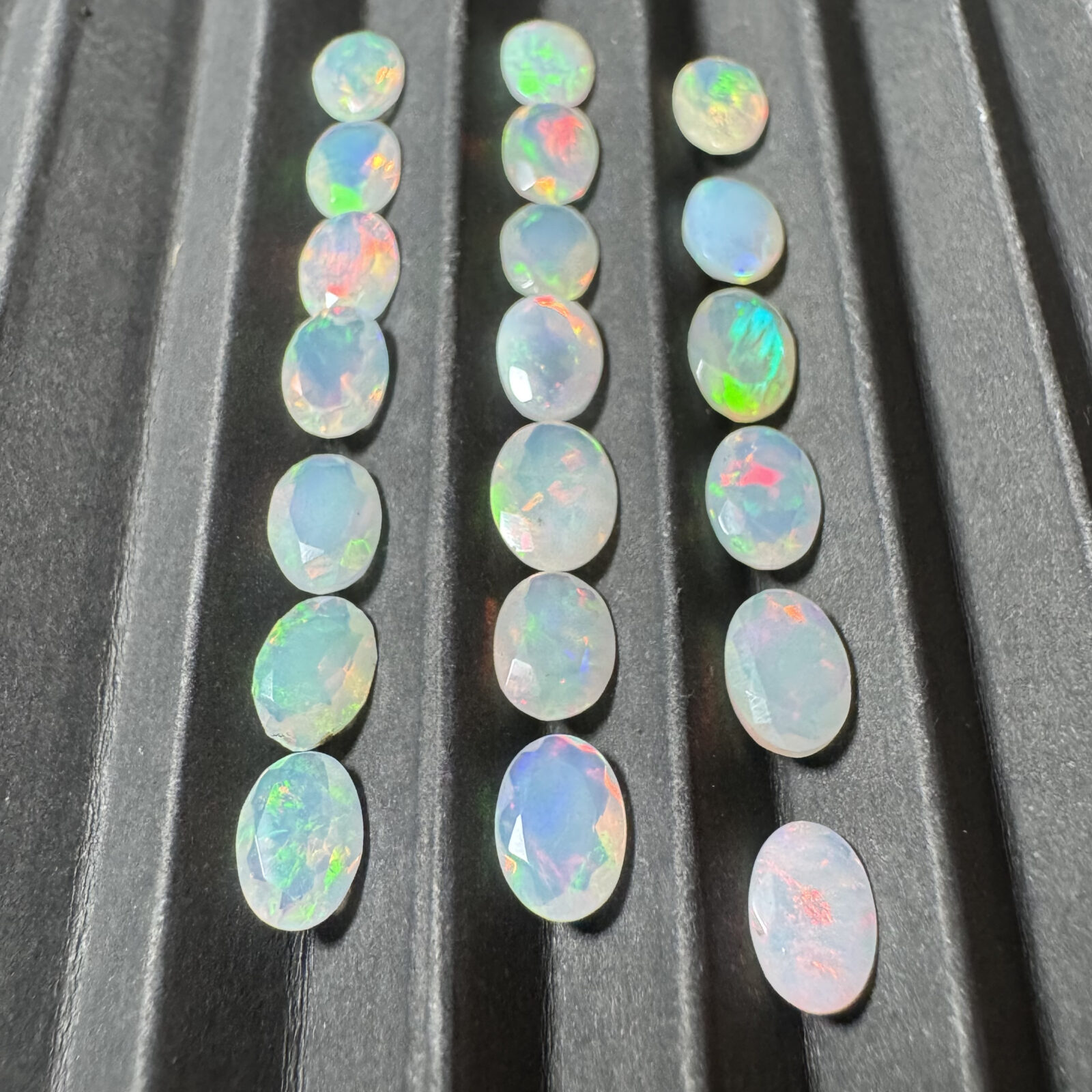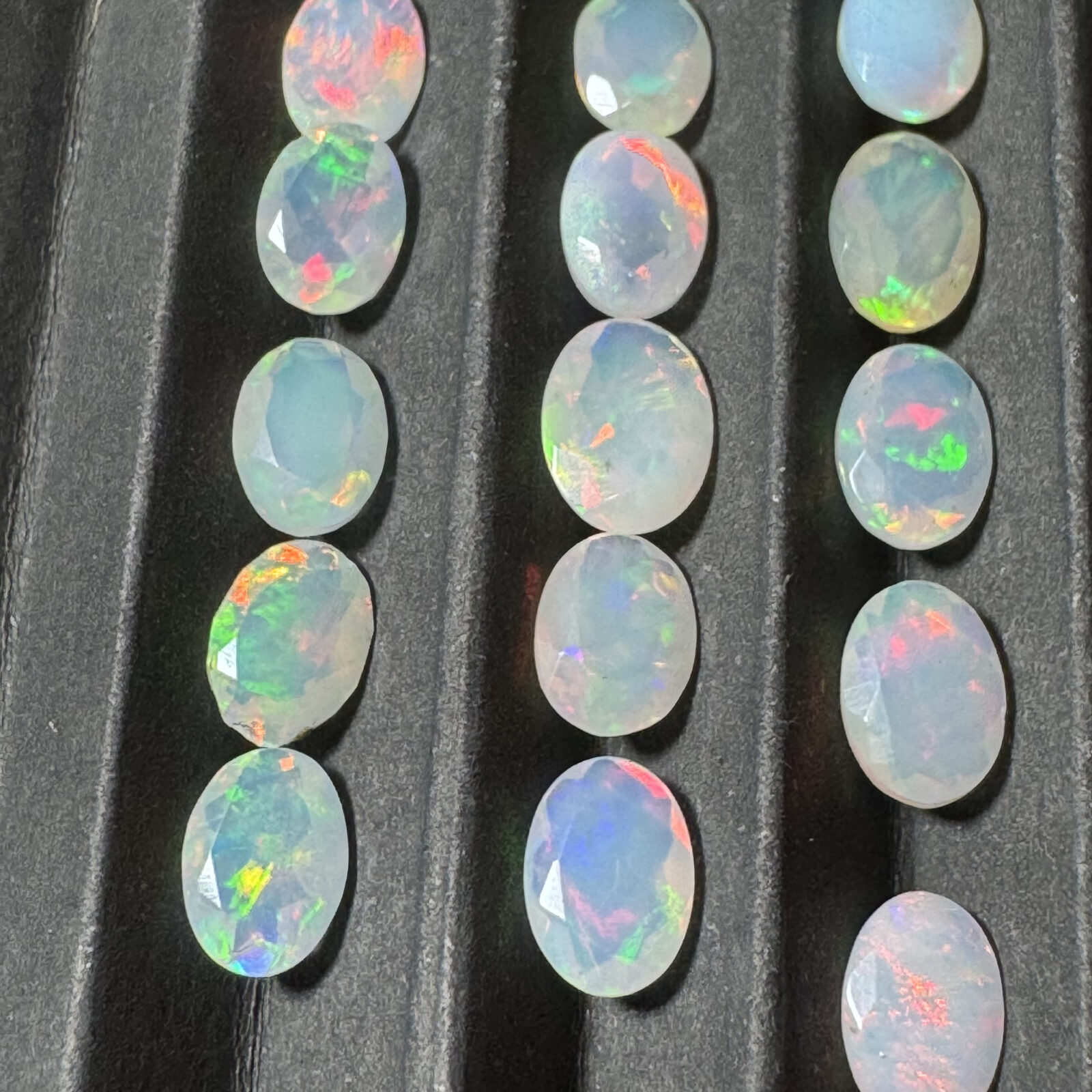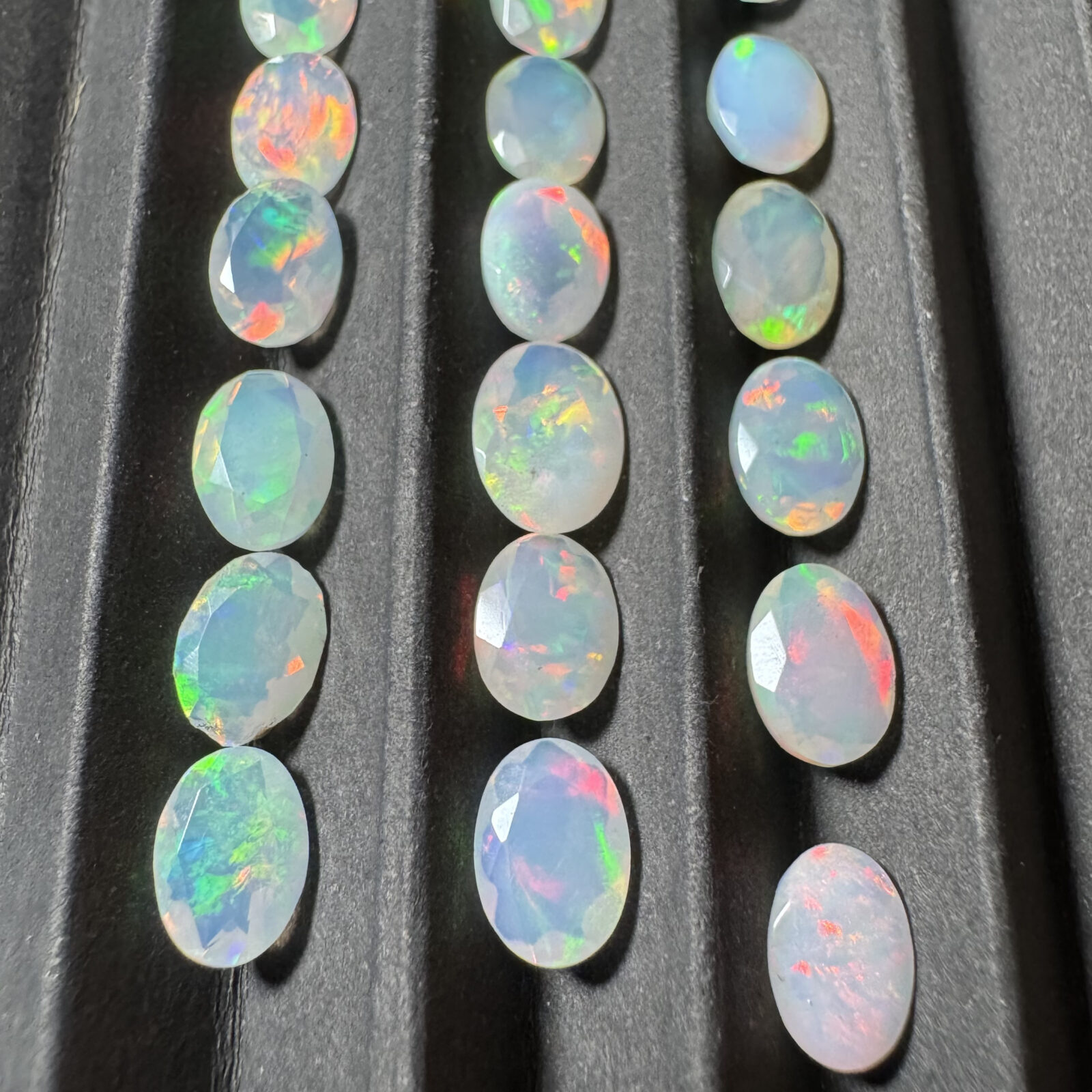 Opala natural lapidada facetada, com jogo de cores intenso e brilho interno característico.