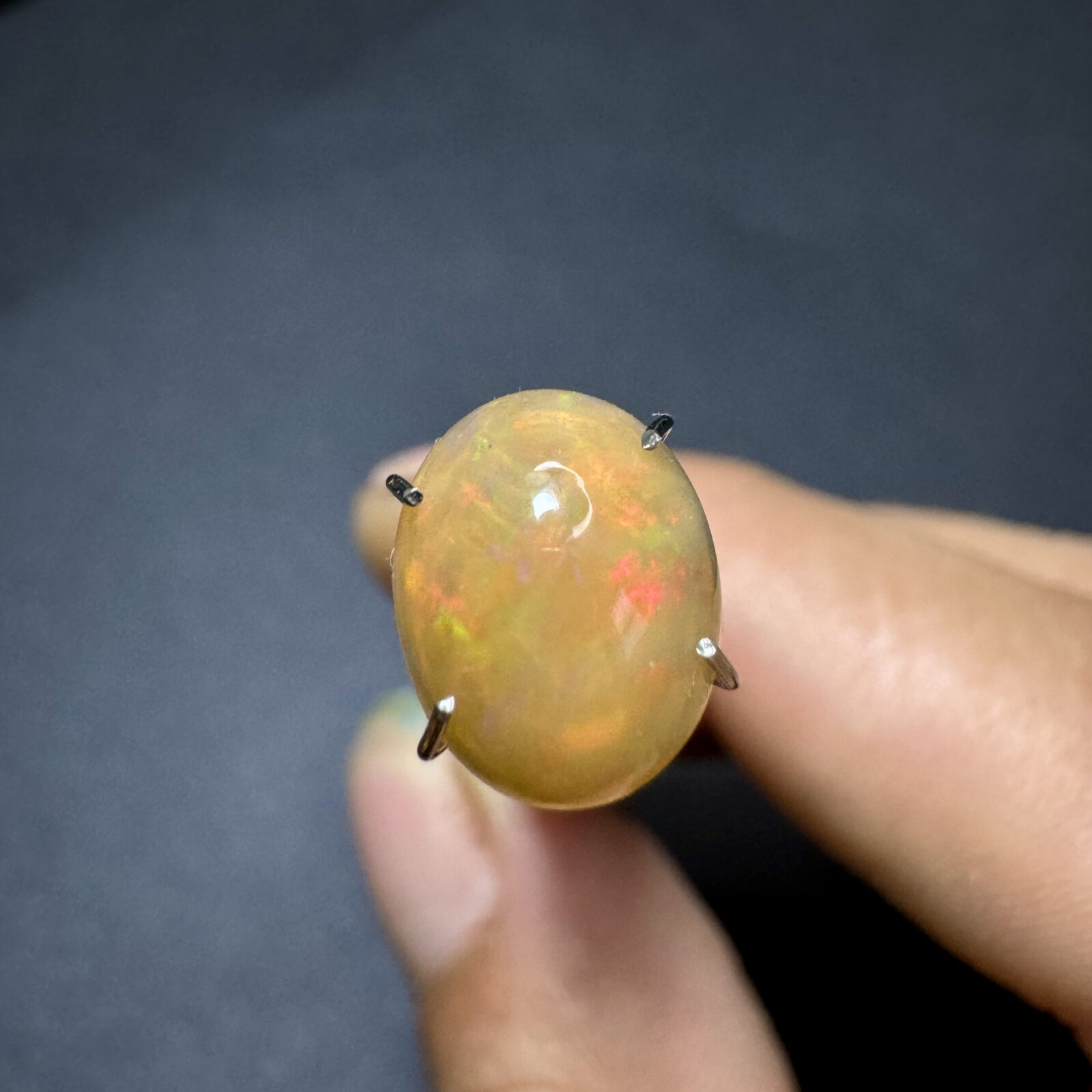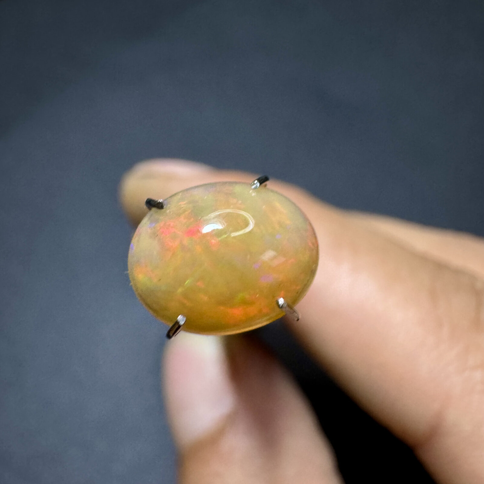 Opala natural lapidada em cabochão, com jogo de cores intenso e brilho interno característico.
