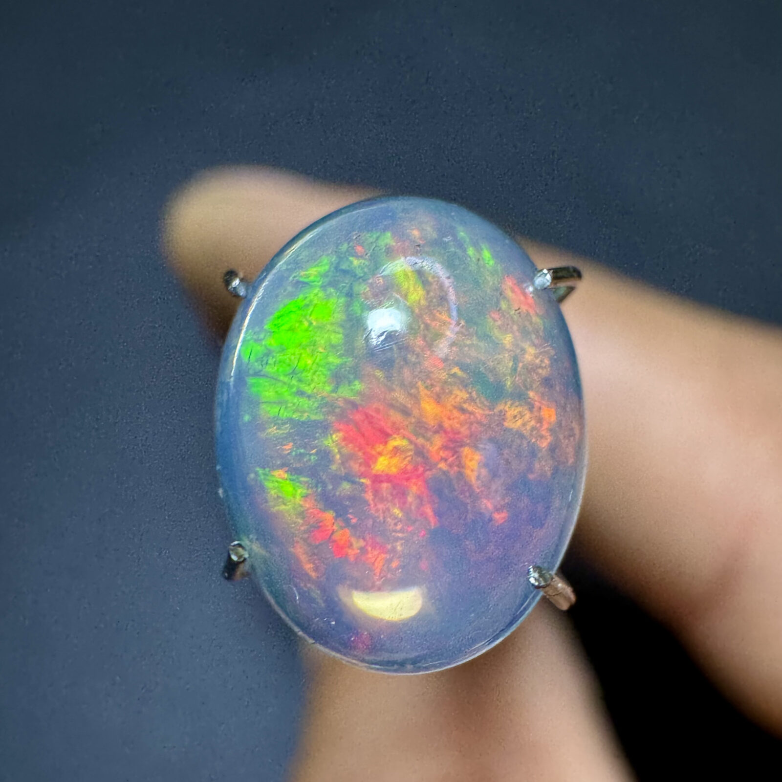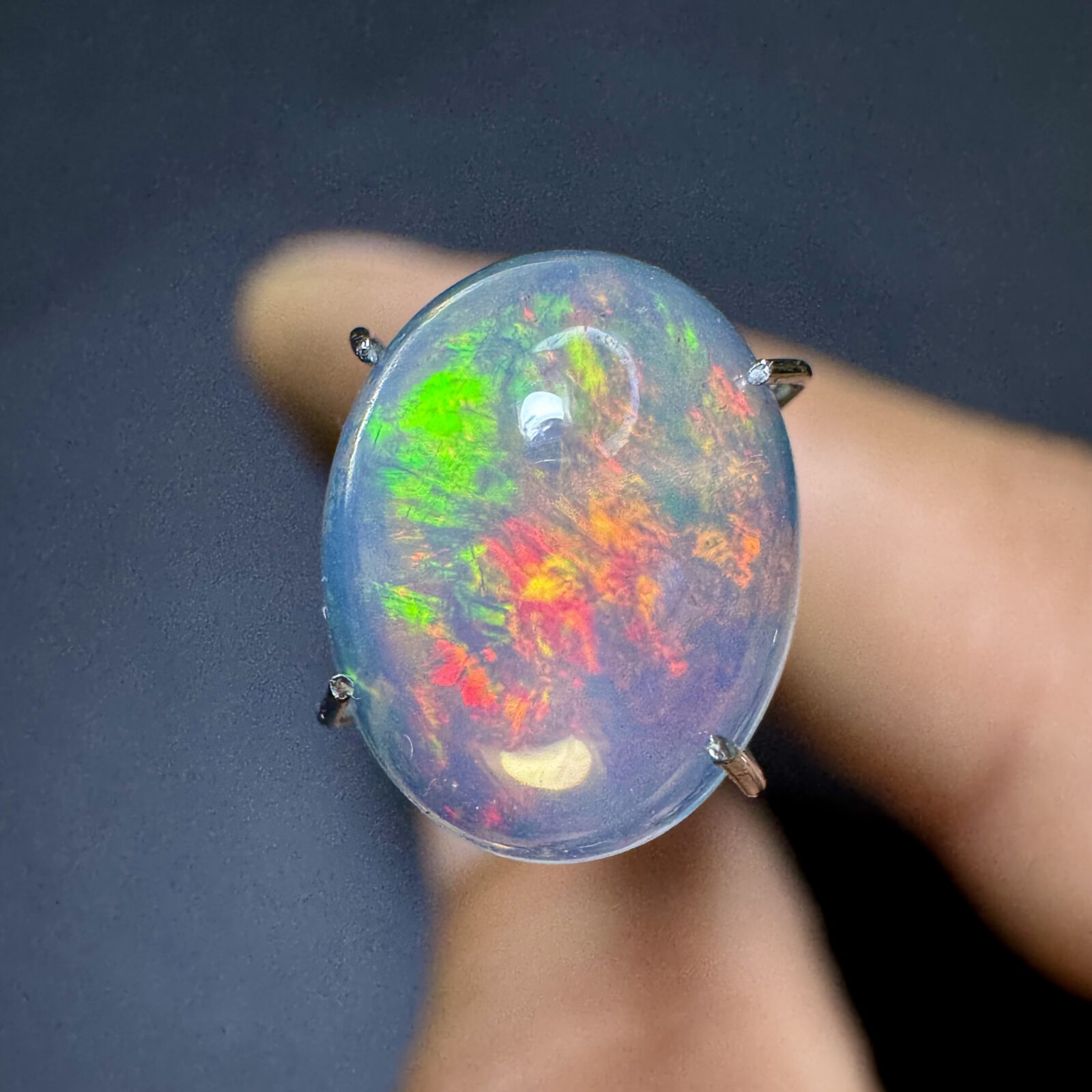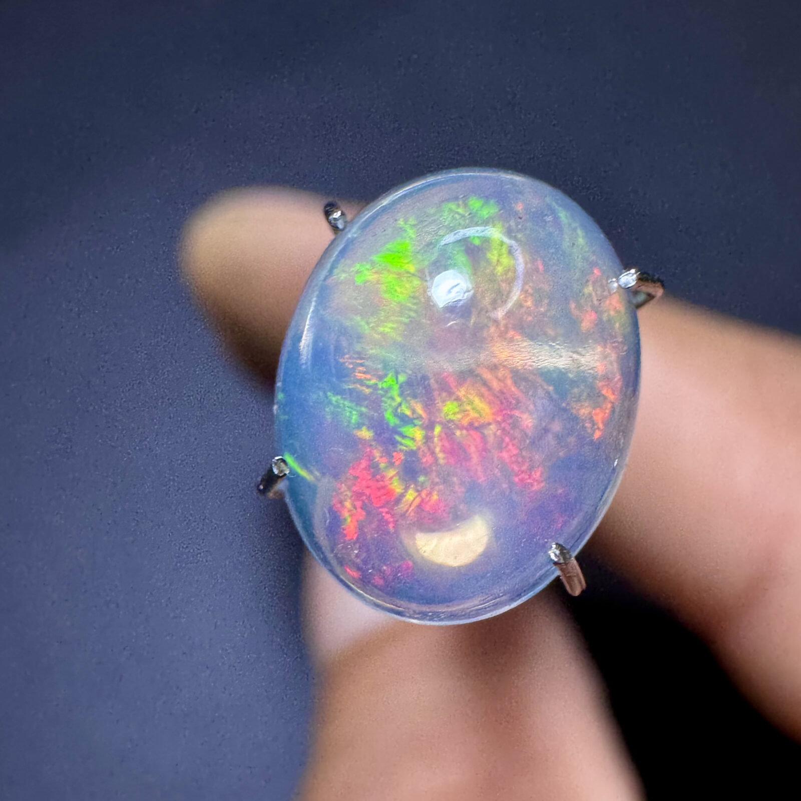Opala natural lapidada em cabochão, com jogo de cores intenso e brilho interno característico.