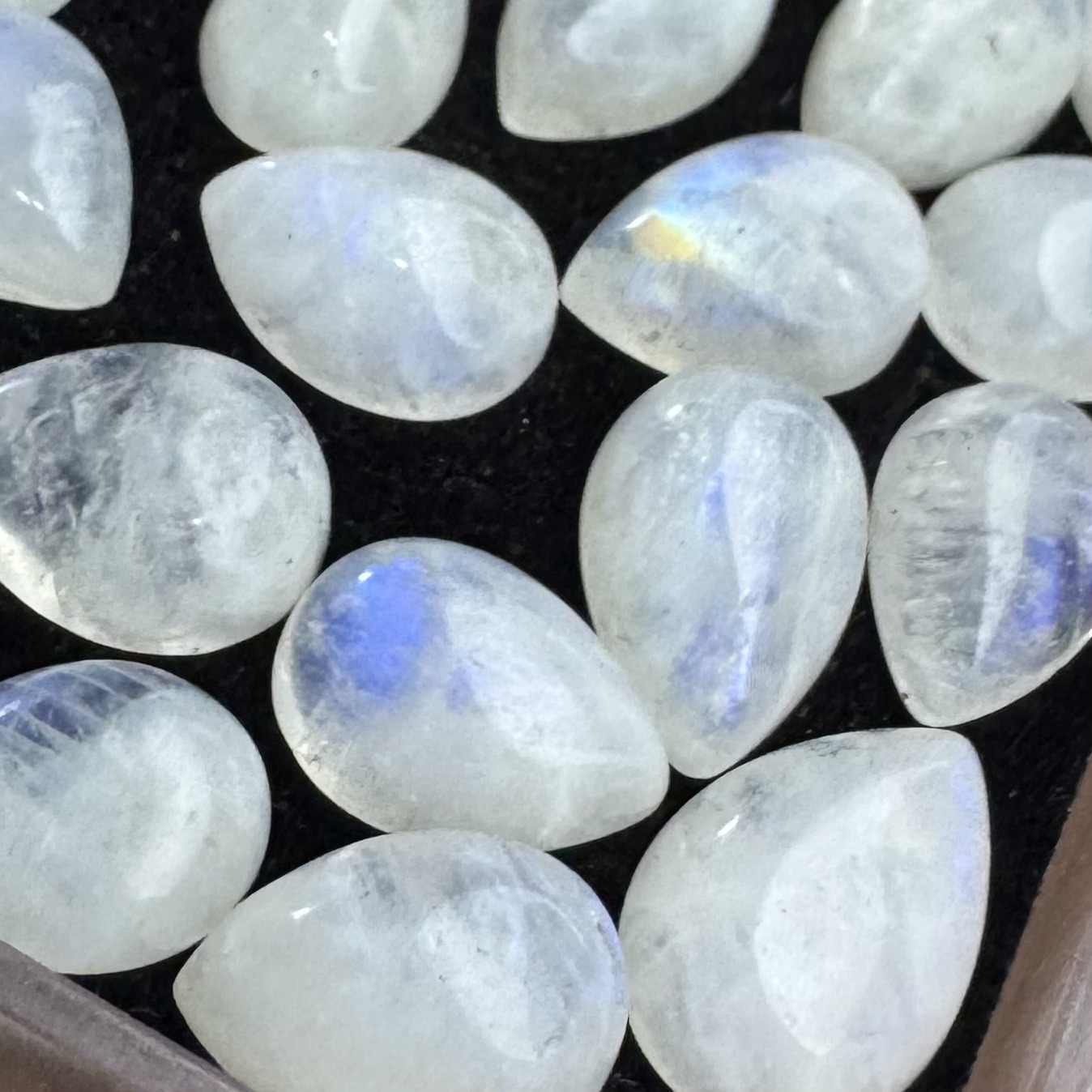 Pedra da Lua Natural de alta qualidade. Cabochão calibrado com cúpula lisa e base regular, ideal para caixinhas de joias ou cravaçao. Indicada para brincos, anéis e pingentes com forte efeito cintilante.