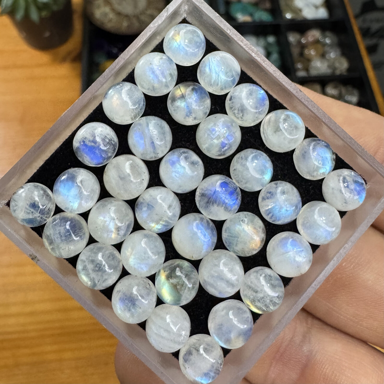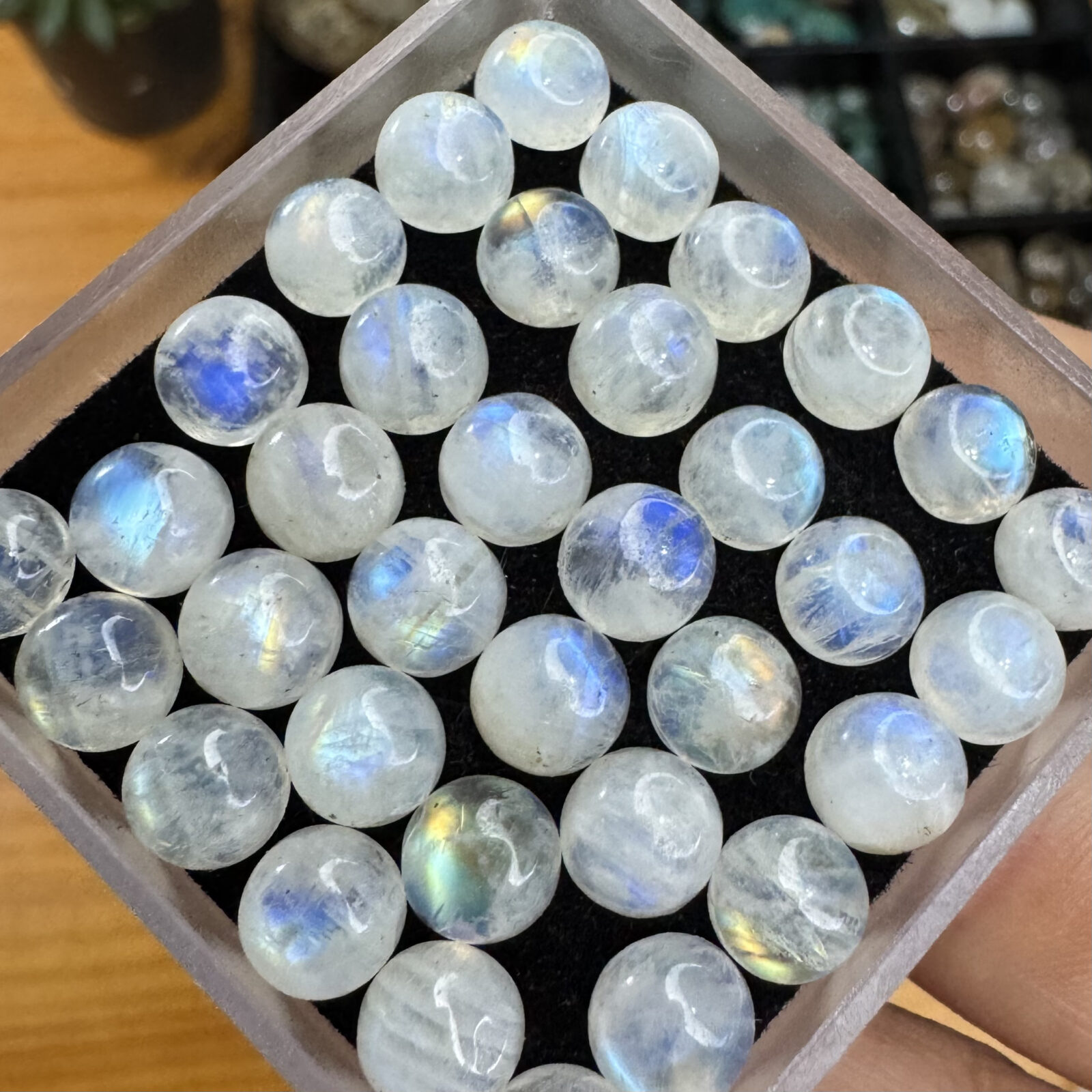 Pedra da Lua Natural de alta qualidade. Cabochão calibrado com cúpula lisa e base regular, ideal para caixinhas de joias ou cravaçao. Indicada para brincos, anéis e pingentes com forte efeito cintilante.