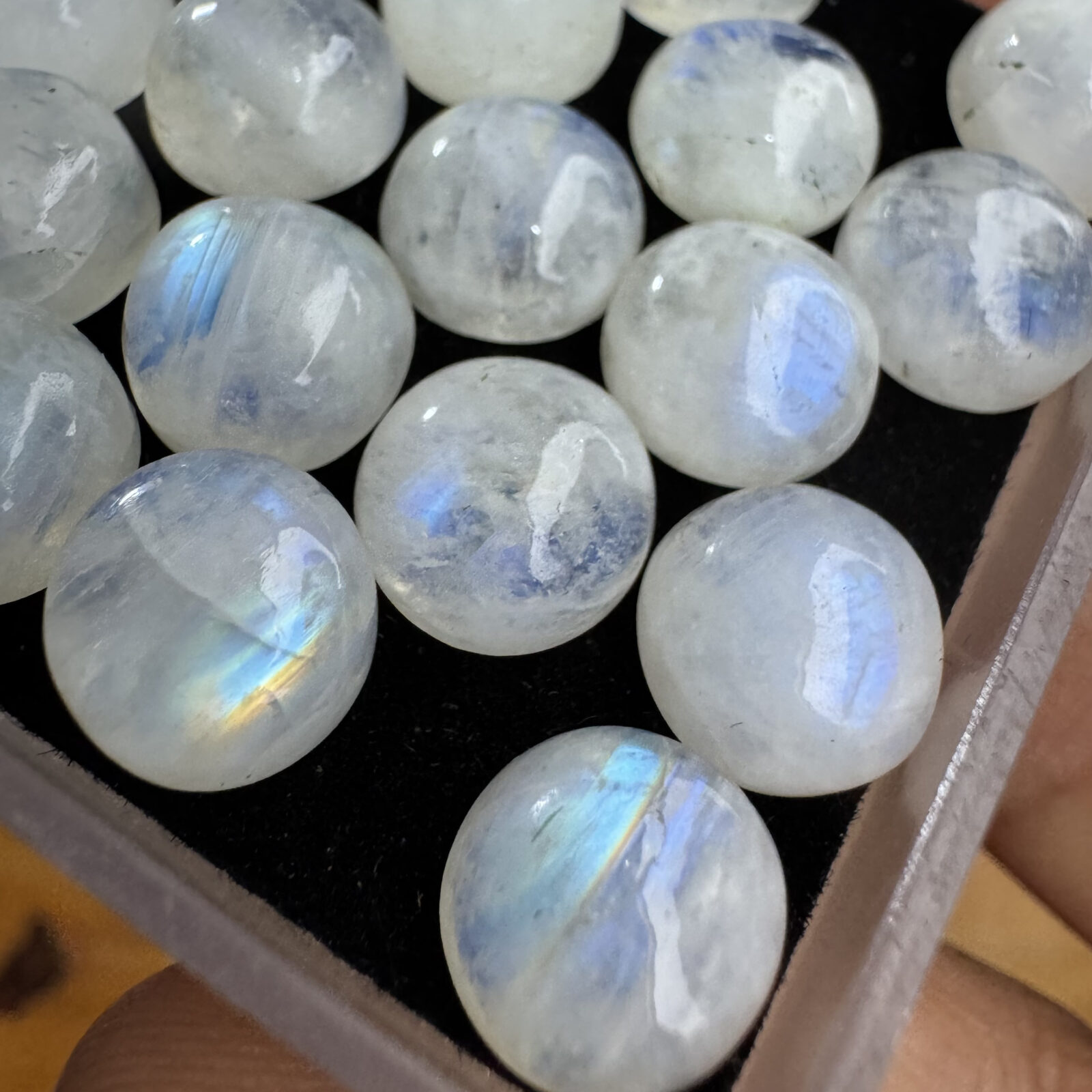 Pedra da Lua Natural de alta qualidade. Cabochão calibrado com cúpula lisa e base regular, ideal para caixinhas de joias ou cravaçao. Indicada para brincos, anéis e pingentes com forte efeito cintilante.