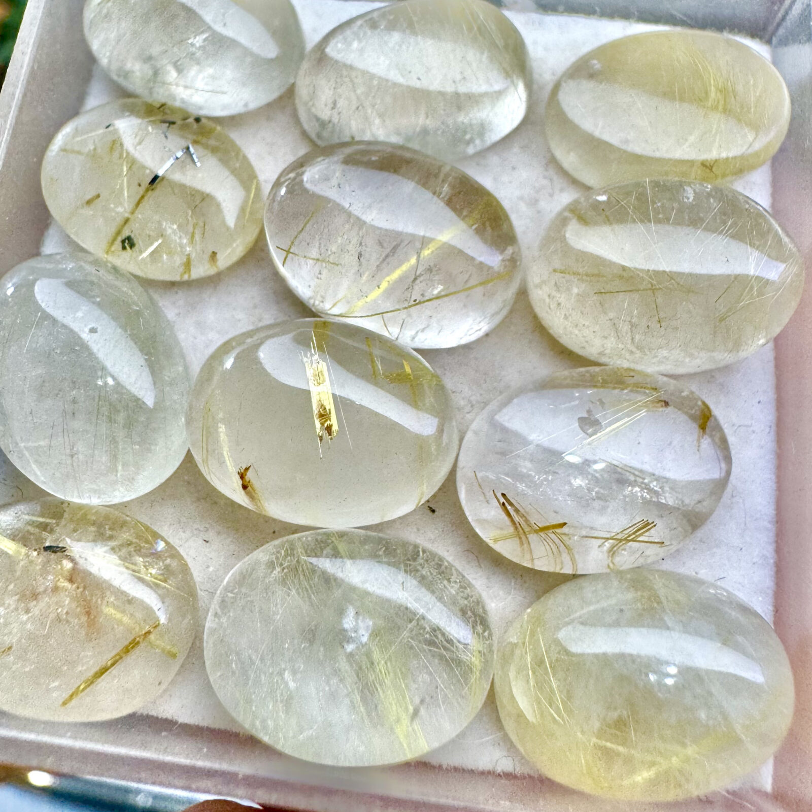 Quartzo natural com rutilo dourado visível, lapidação cabochão em diversos formatos. Cúpula regular, base plana e polimento uniforme para realçar os filamentos dourados. Indicado para pingentes e anéis de destaque.