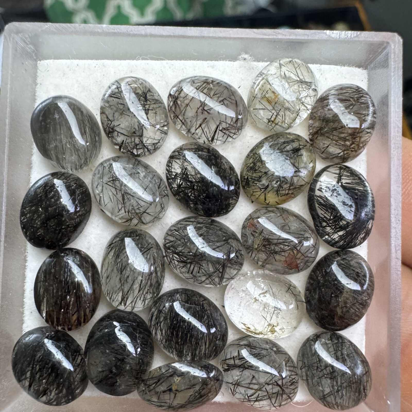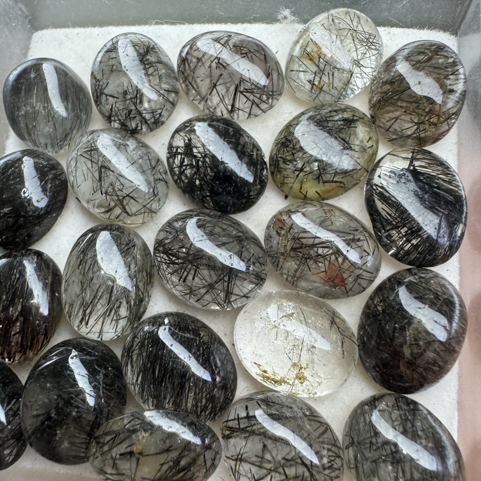 Quartzo natural com inclusões de turmalina negra (agulhas/dendríticos) lapidado em cabochão. Transparência variável, padrões internos visíveis e polimento que realça as inclusões. Ideal para peças com estética orgânica.