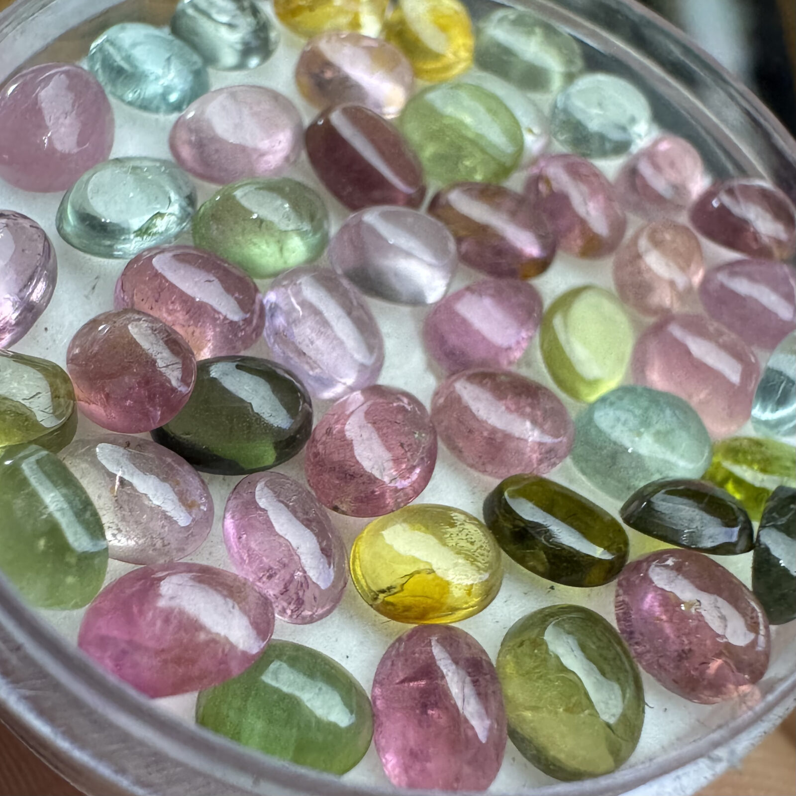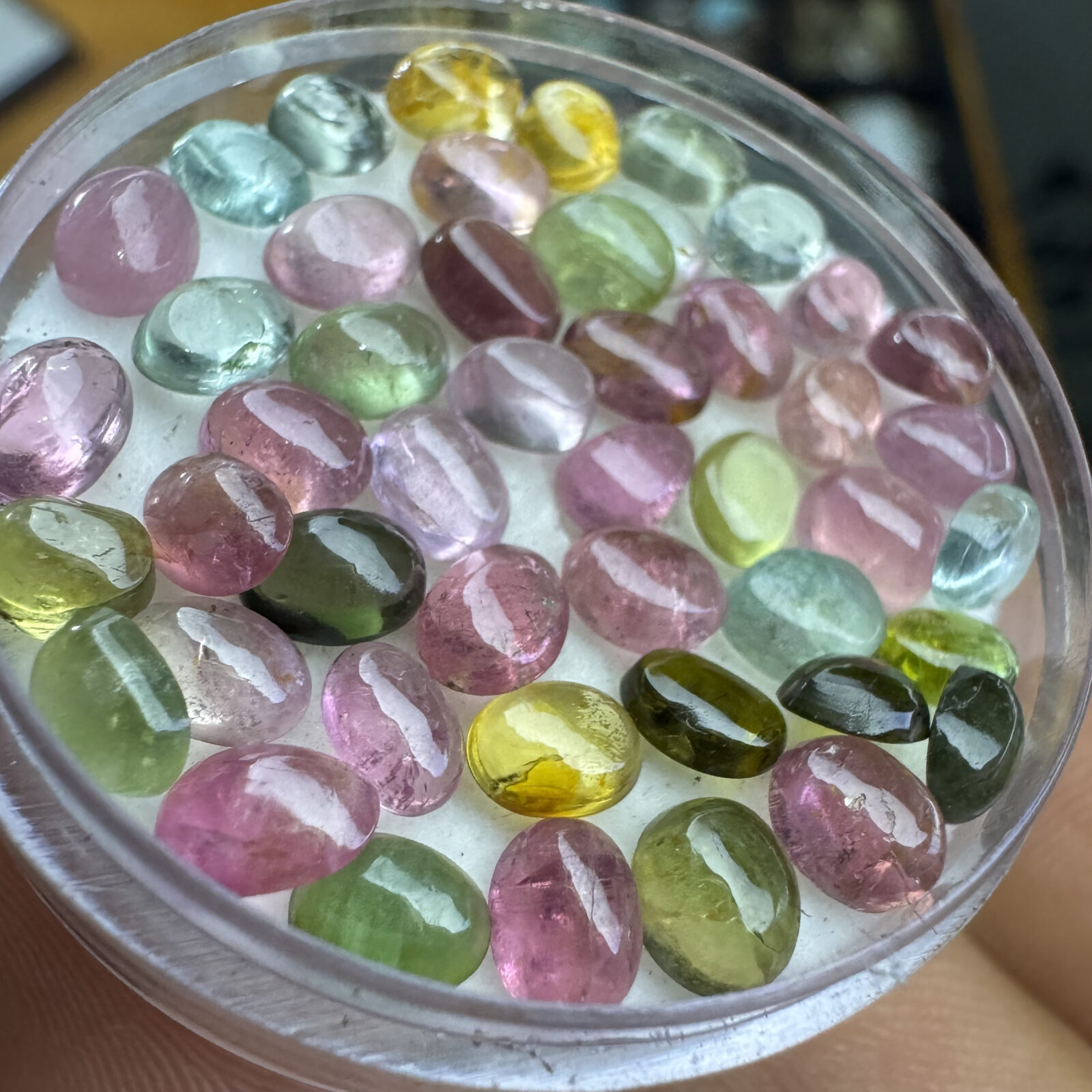 Conjunto de 10 turmalinas naturais com cores variadas, lapidações uniformes conforme o formato indicado. Tamanhos compatíveis com cravações comerciais, polimento regular e calibração adequada para produção em série. Fornecimento em lote fechado de 10 unidades de cores mix, tambem disponivel na forma unitaria
