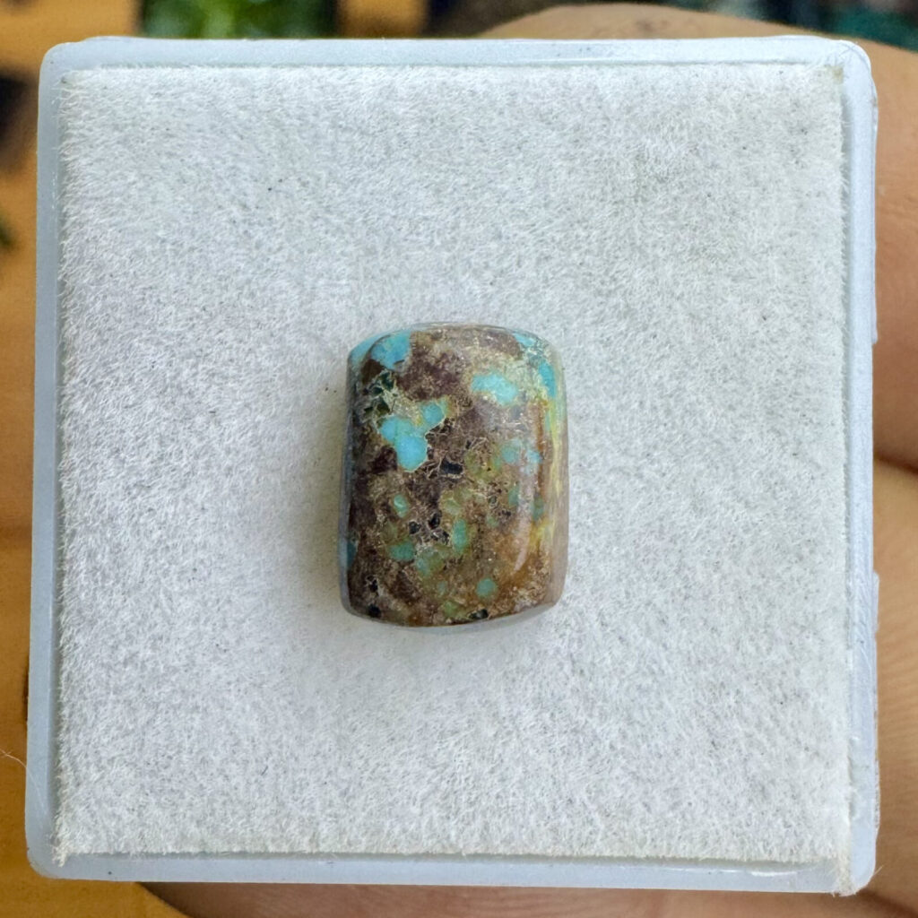 Cabochão de Turquesa Tibetana natural, com coloração azul-esverdeada e veios terrosos característicos. Cada peça é única, lapidada artesanalmente e polida para realçar o brilho natural da pedra. Base regular e acabamento liso, ideal para montagem de anéis, pingentes e joias autorais.